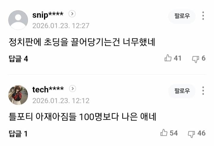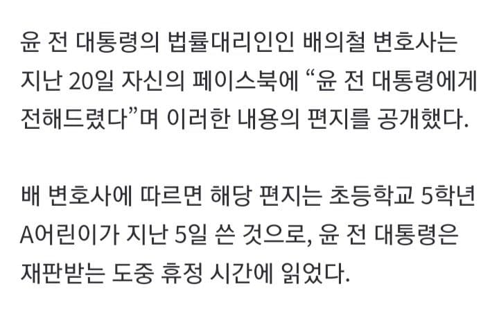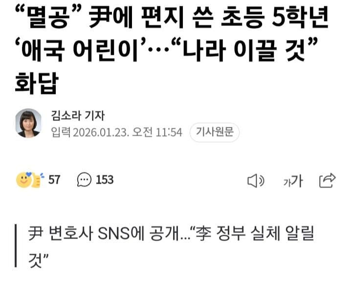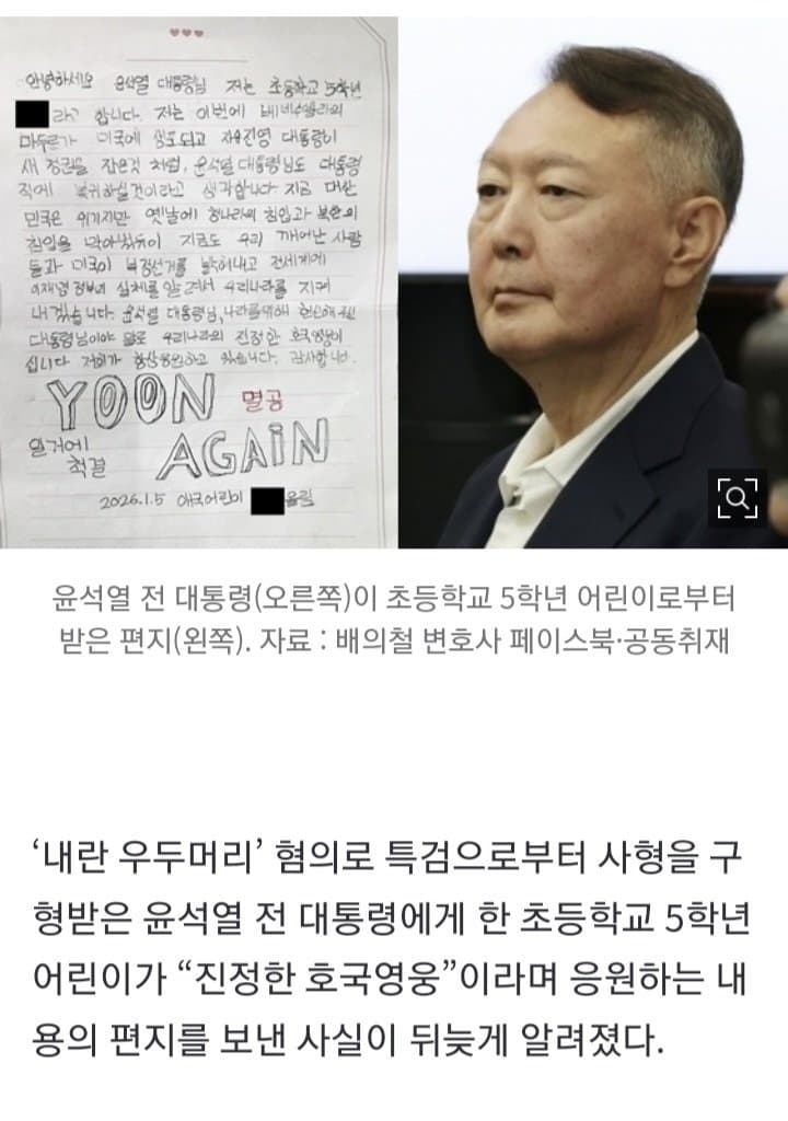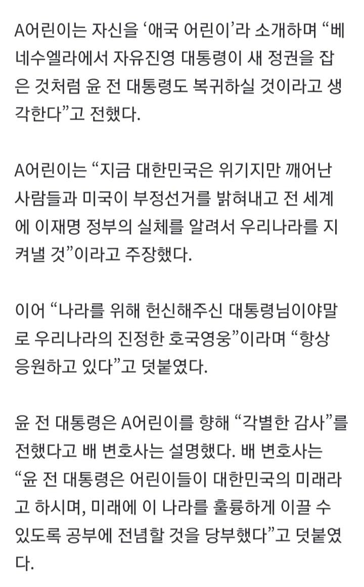 진짜라면 저런 내용이 아니라 그냥 진짜 초5 답게 옛날 초딩들한테 학교에서 강제로 군인들한테 편지 쓰게하던 시절처럼 그냥 윤석열 아저씨 멋있다 대통령 할때 학교에 ~해줘서 좋았다 이런 내용이였으면 조금이라도 선동되었을건데 ㅋ 거의 뭐 내 주변에 골수 우파보다 더 정치적으로 작성해놨으니 진짜라해도 처음부터 초5가 맞냐는 말이 더 많이 나오니 ㅋㅋ
