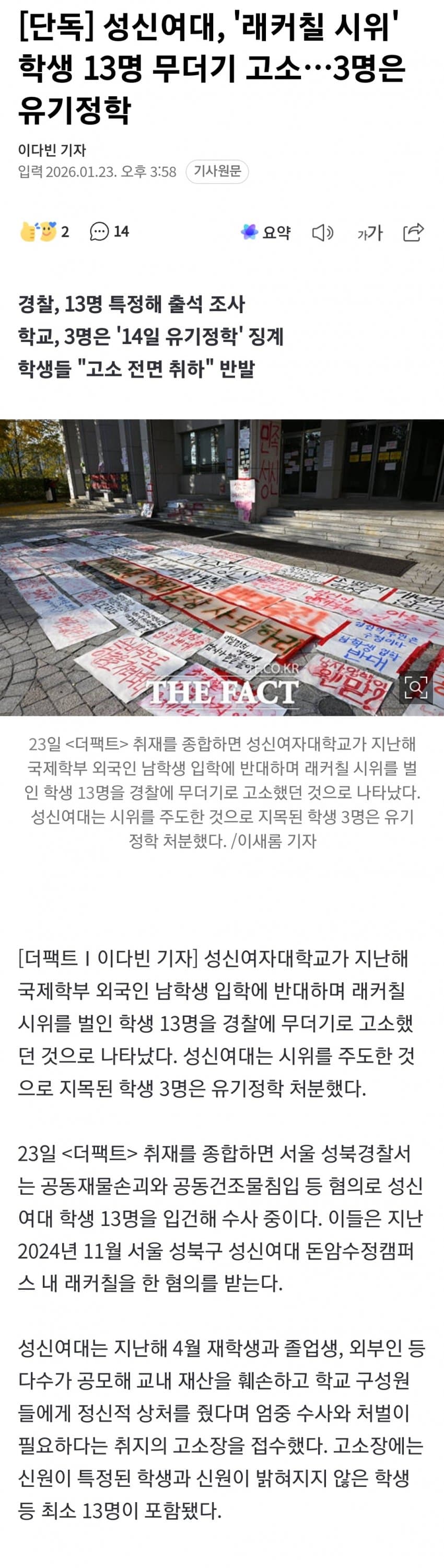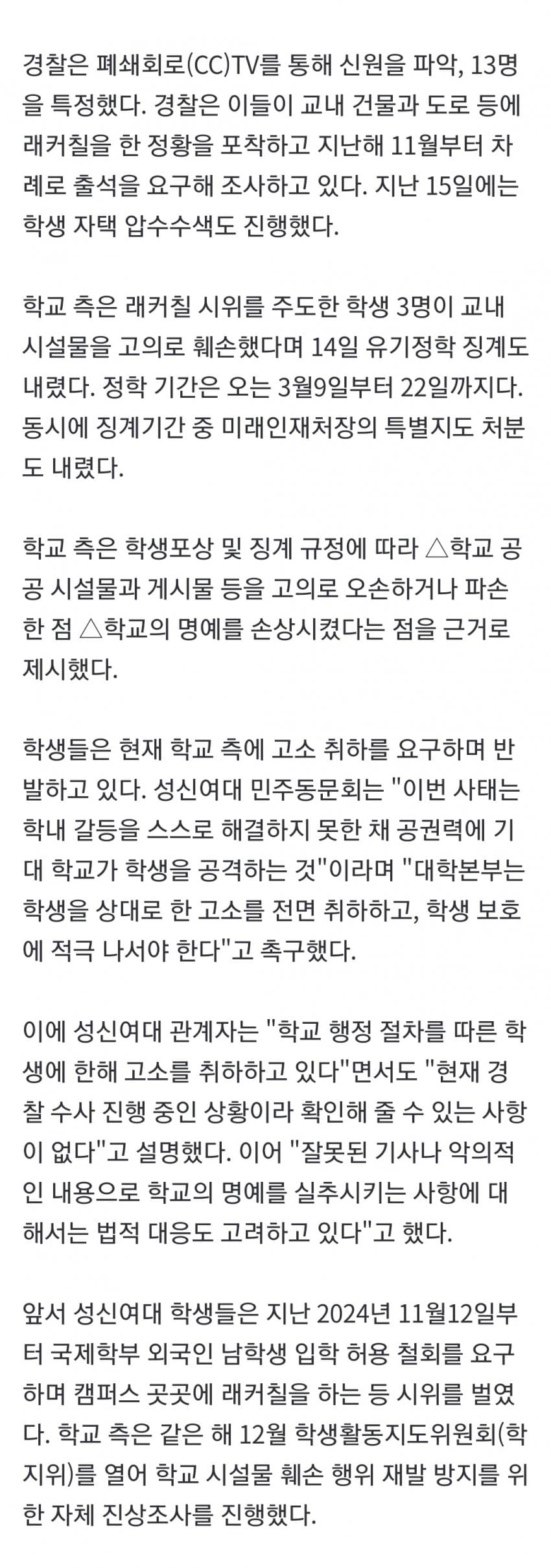 안타깝지만 이거 딱 보니까 동덕여대 엔딩 각임.그냥 고소만 했으면 모르겠는데 "압수수색"이 결정적 빌미가 됨. 지금 언론이랑 매체에서 슬슬 재점화 중인데, 이거 불붙을수록 손해 보는 건 성신여대 쪽임