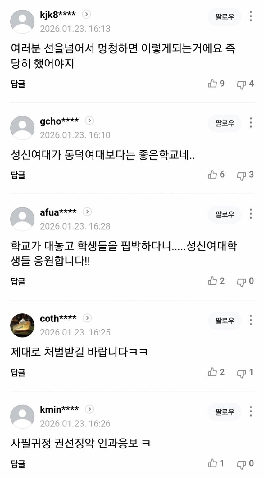 크, 성신여대 나름 상식적인 대처를 하고 있네. 동덕이랑은 클래스가 다르군. 아니면 동덕을 보고 배운 점이 있거나