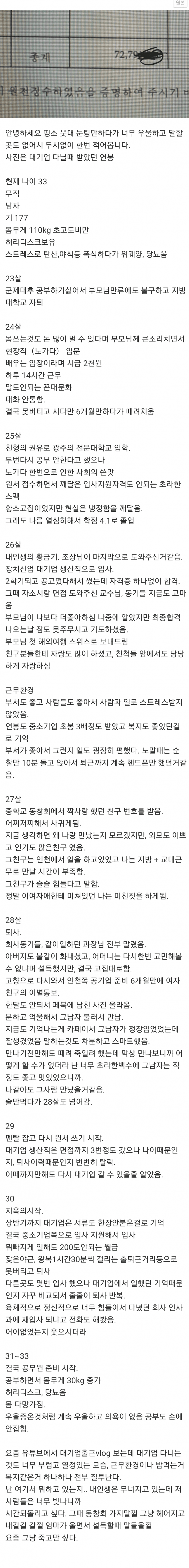 5년전 33살쯤이라는거 보니 89~90쯤 되는 나이같은데26~27살에 연봉 7천이면 그때 당시만 하더라도 생산직 빡센곳이 세금떼고 5천 전후로 왔다갔다했는데대기업 생산직이라 그런지 훨씬 더 많이 주네 ㄷㄷ 근데 그런 곳을 박차고 나왔다니 ㄷㄷ;;;거기서 경력쌓고 여태 일했으면 연봉도 많이 올라갔을거고 진짜 개 ㅈ같긴 하겠다