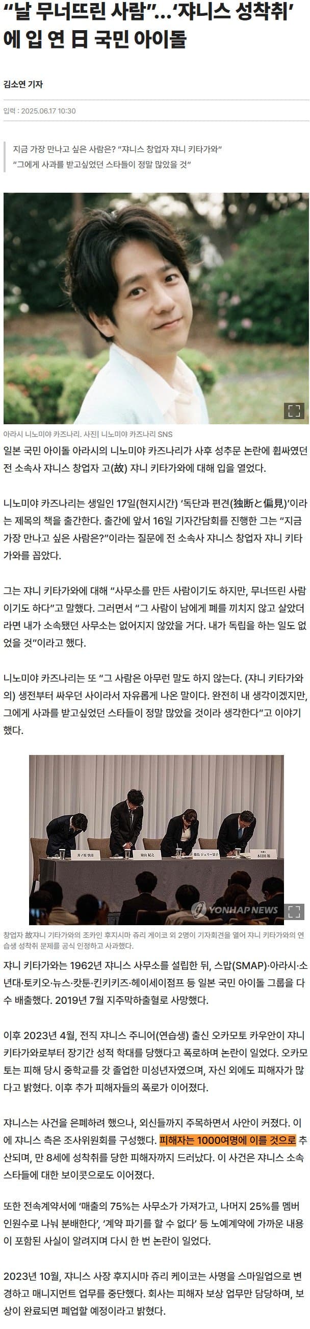 2023년 9월 후지시마 쥬리케이코(쟈니 키타가와의 조카) 쟈니스 사장이 모든걸 인정하고 사죄하며 퇴임하게 된다