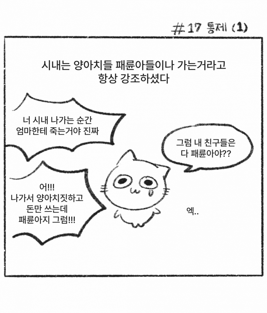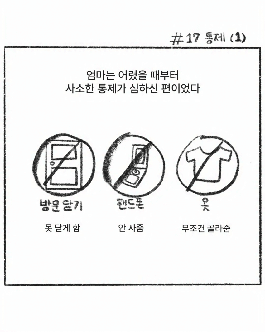 남자버전도 있다 본인 학교 졸업때까지 컴퓨터게임 집에서 해본적 없고 컴터는 비밀번호로 잠겨있었음방문 잠그기 금지 집에서 코코이도 못침용돈 현금으로 받아본적 없고남들 초등학교때부터 있던 폰도 중학생때 처음 개통하고 그마저도 같잖은 이유 들이대며 계속 정지당함중학교때 친구들이랑 피시방 처음갔다가머리끄댕이 잡혀서 나옴