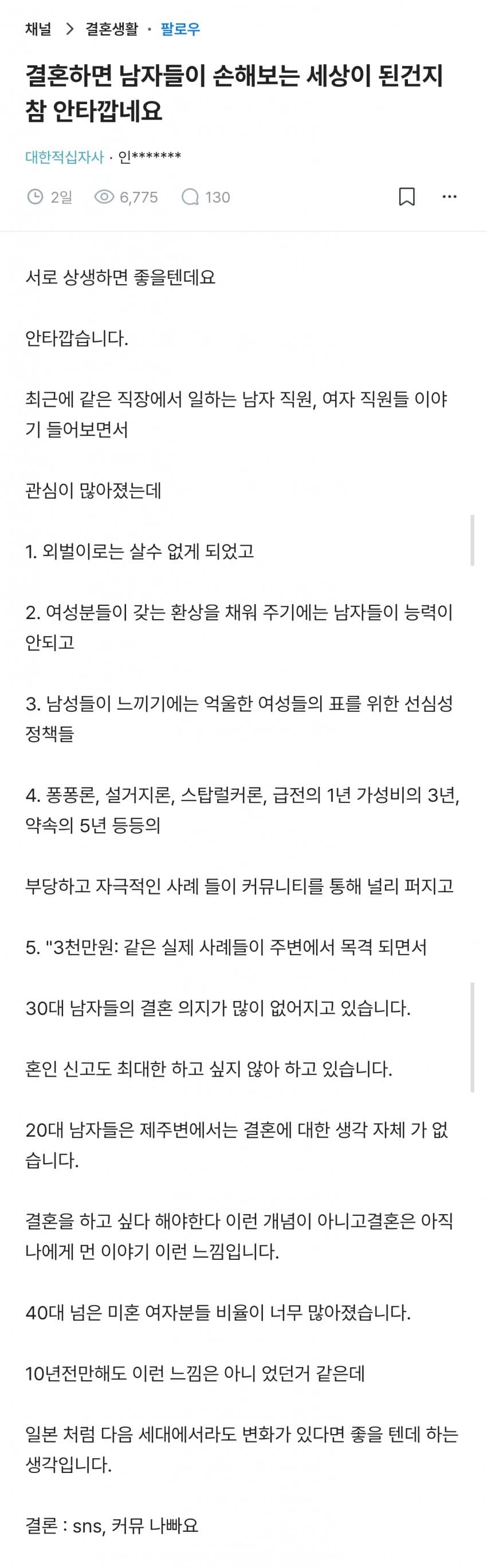 결혼을 못하는 원인을 남자는 자기 탓을 하는데 여자는 상대 탓을 한다. 남자는 자신의 재산을 고려해 결혼할지 판단하는데 여자는 상대의 재산을 고려해 결혼을 판단하고 이것 말고도 남자는 돈 모으면 가정을 꾸릴 생각 하는데 여자는 자신이 힘들 때 결혼을 생각한다.혼인을 1년만 유지하더라도 여자가 잘못해서 이혼해도 결혼 이후에 늘어난 재산은 일부라도 재산분할을 해주는게 이 나라 법이고 이걸 악용하고 있음. 양육권도 엄마가 애를 더 잘 키운다는 선입견에 빠진 대부분 나라의 법원에서 엄마한테 준다.(형사사건도 마찬가지 동일 범죄여도 여자의 형량이 낮음.) 남자는 재산분할에 이어 양육비도 뜯기지. 여자가 배신을 하면 남자가 무조건 손해보는 합법적 구조인데 누가 문제고 결혼이라는 제도에 생각을 해보자