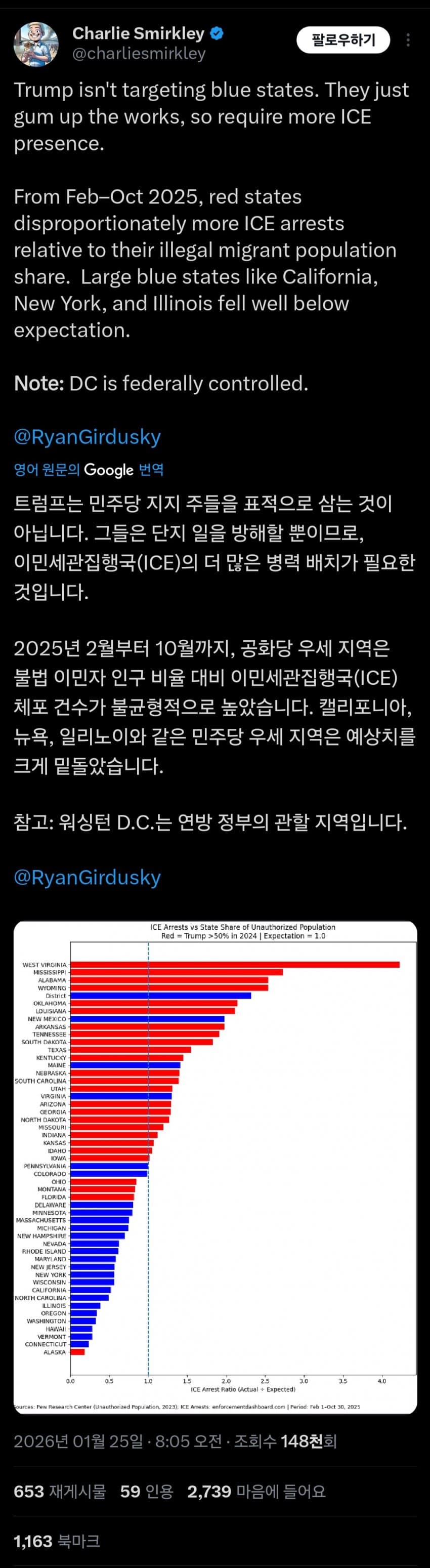 대체로 트럼프가 과반을 얻은 주들에서 인구 대비 더 많은 불체자들이 ICE에 체포되었음