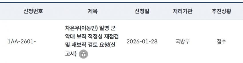 이에 본인은 해당 사안이 군의 대외 신뢰와 장병 사기에도 영향을 미칠 수 있다고 판단하여, 28일 국방부에 차은우(이동민) 일병의 군악대 보직 적정성 재점검 및 재보직 검토를 요청하는 신고서를 제출하였음을 알린다.