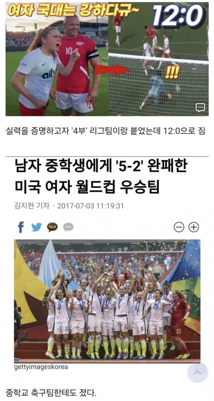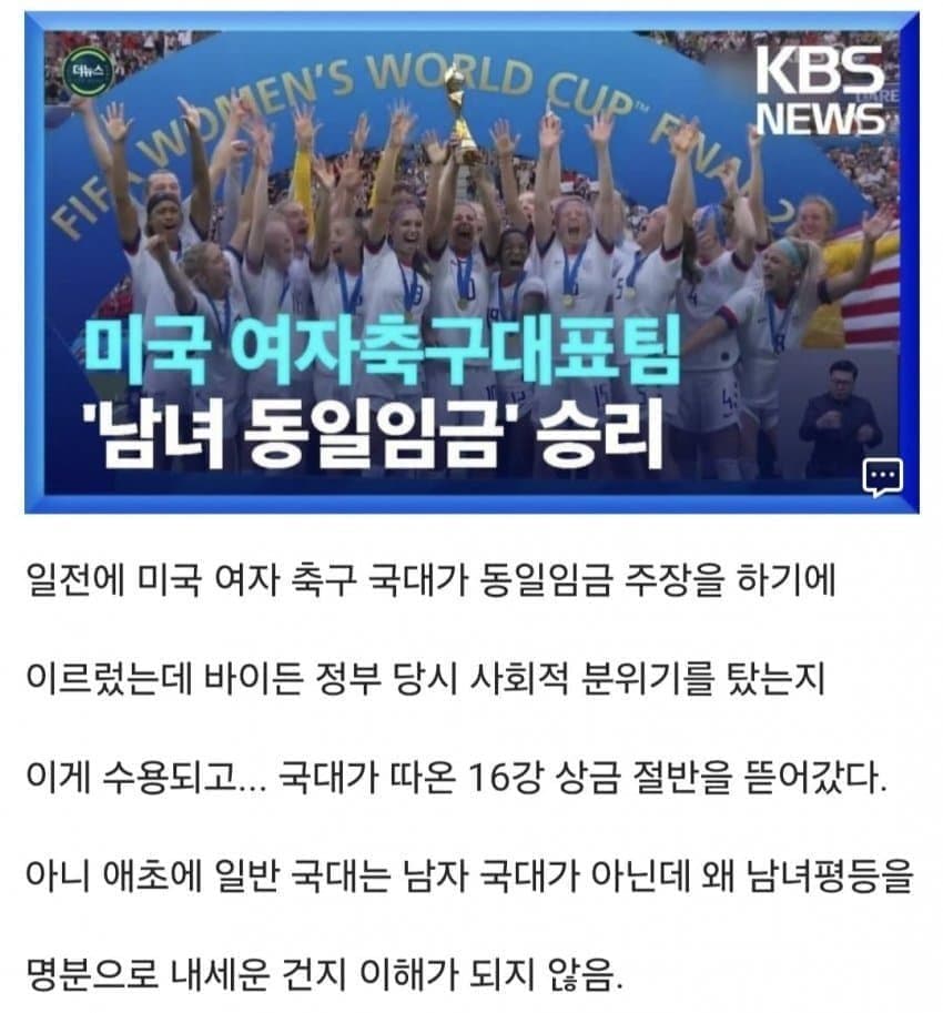 성별을 떠나서 철저하게 피지컬, 실력만으로 승부보는게 스포츠 아니냐?남자 선수라도 중학생한테 질 실력이면 낮은 대우 받는건 당연한건데;여자 선수들이 남자 선수들이랑 실력 실적이 거의 동급인데 돈을 적게 받는다? 이건 100% 차별이지만현실은 그렇지 않잖아?무슨 배짱으로 돈을 더 받아내려고 하는거임