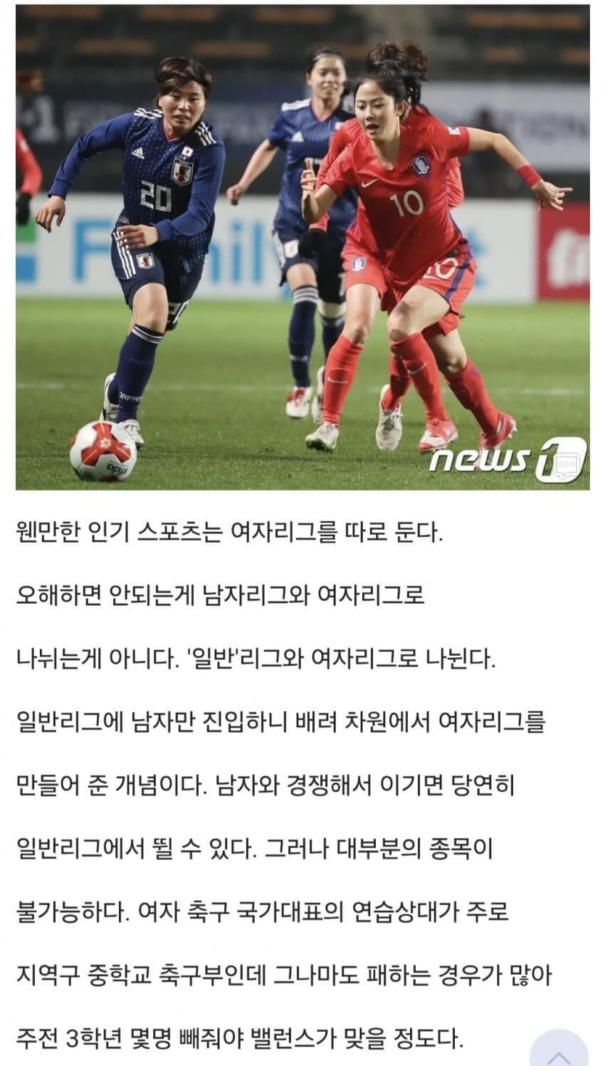 실력보다도 가장 근본적인 문제는 인기임. 골프나 배구도 남자 선수들이 더 실력은 좋은데 여자리그가 돈 더 잘 범. 2부리그도 지루하다고 안보는데 중학생 유망주 선에서 정리되는 여축을 대체 누가 봄?