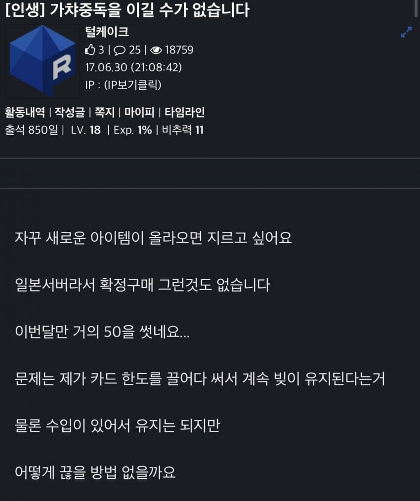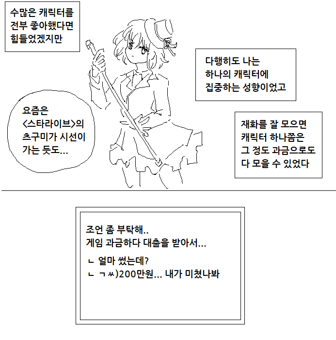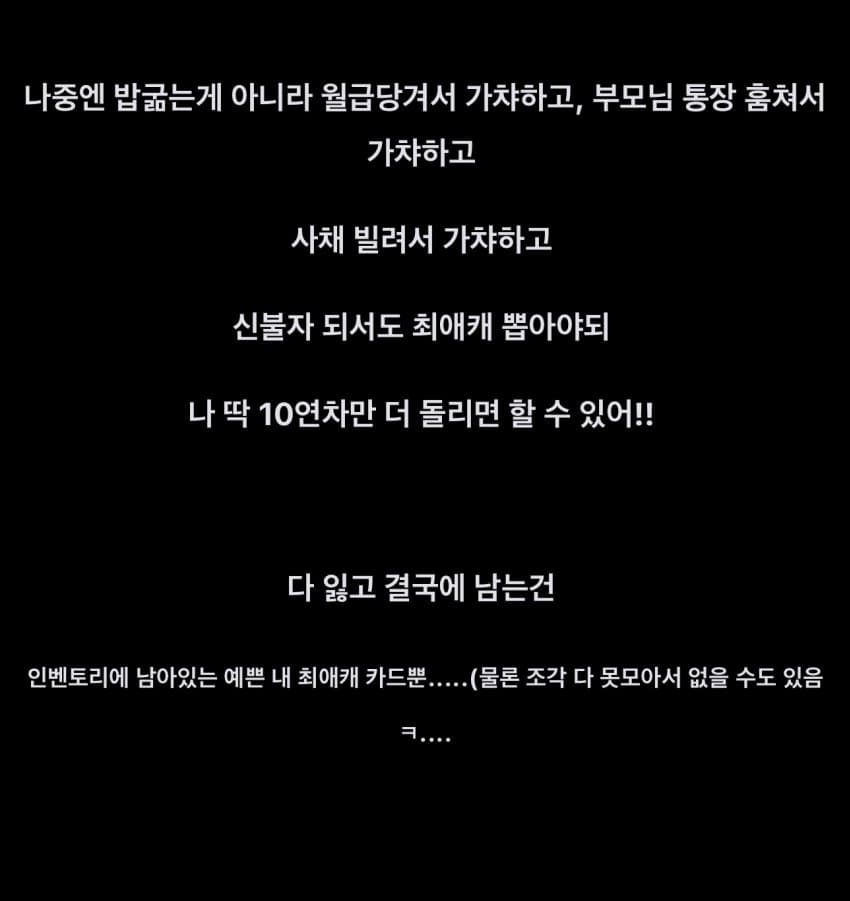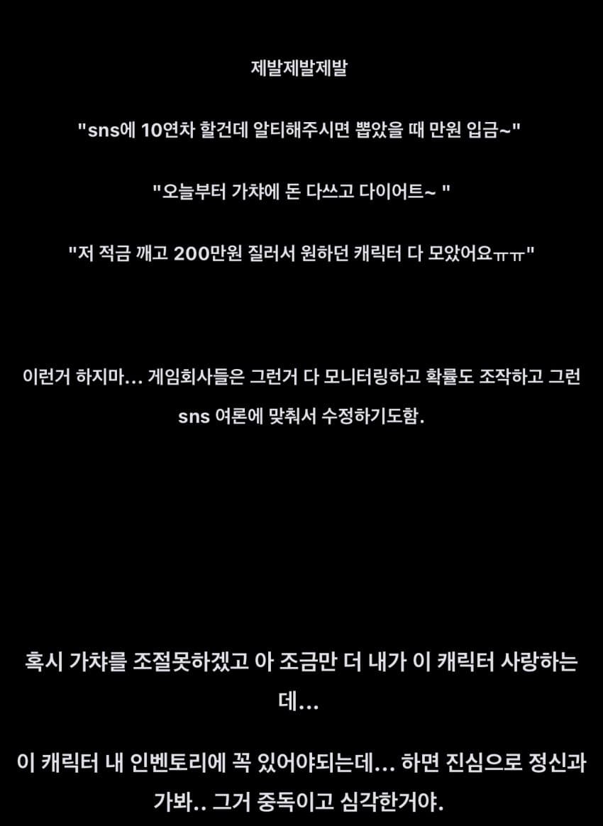 가챠 명함으로 충분히 즐길 수 있는데 풀돌, 2돌전무 욕심내니까 그렇지 거를거 거르고 자기 소득수준에 맞춰서 질러야지 그걸 못하니까 이런 글이 올라왔겠지만