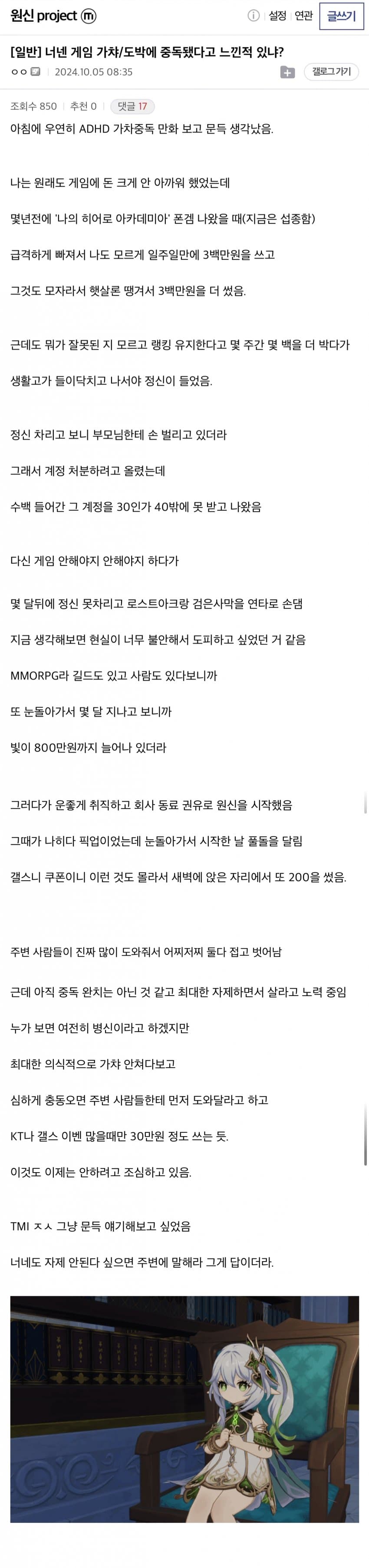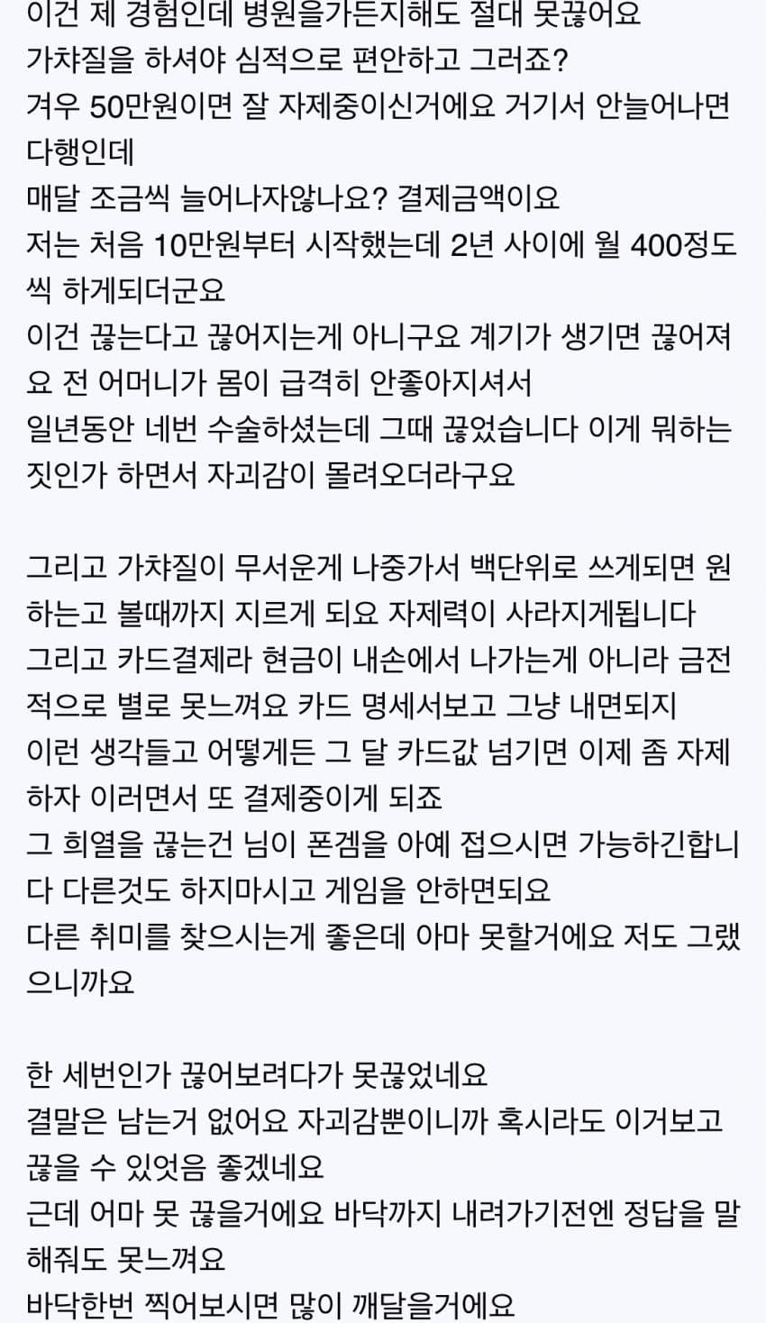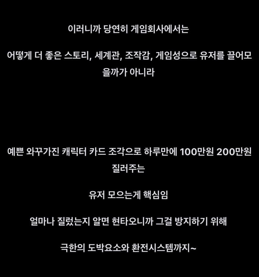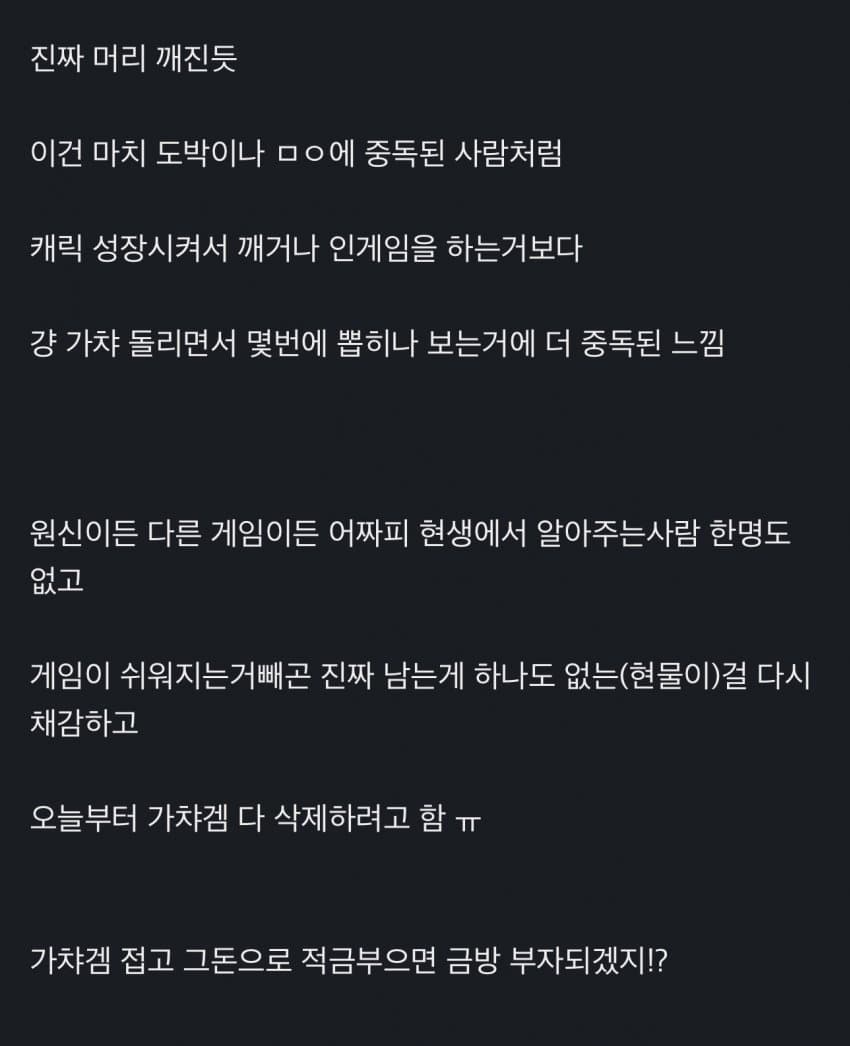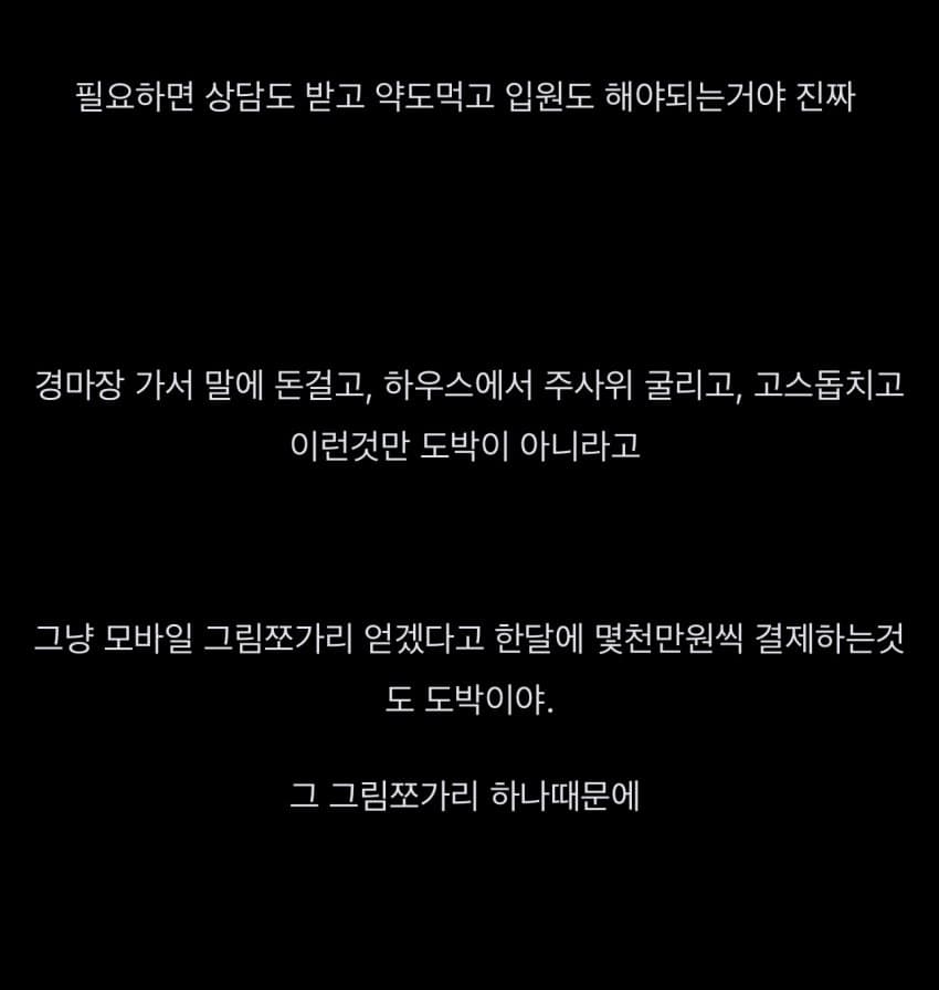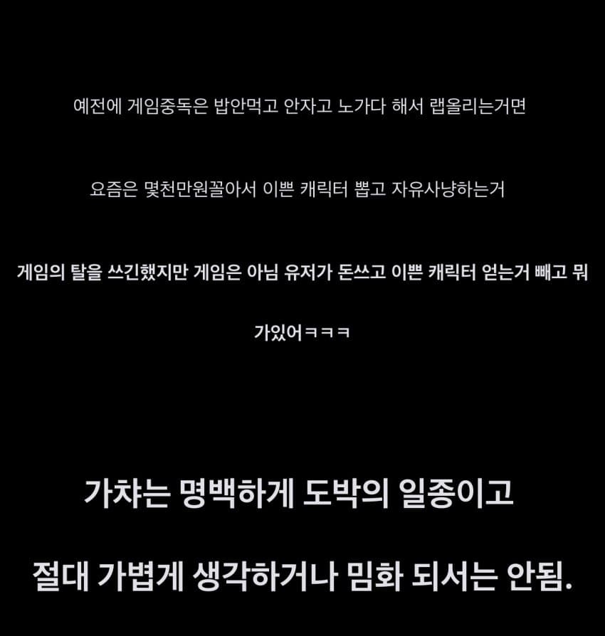 가챠 게임뿐이 아니라, 세상에 어떤 투자재원이들어가는것도 다 중독이 될수있음. 그게 투자나, 사업같은것이라고 하더라도 망하고 사업성 없는 사업 접지못하고 연명하다가 수년수십년을 빚만남기고 쿠팡뛰는사람들 널렸다. 안되는걸 빨리 메타인지하고 정신차리는게 사는길이다