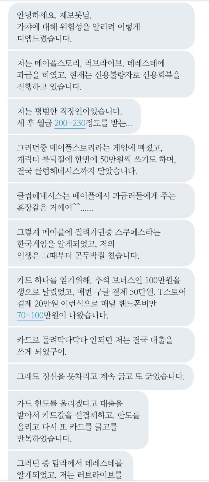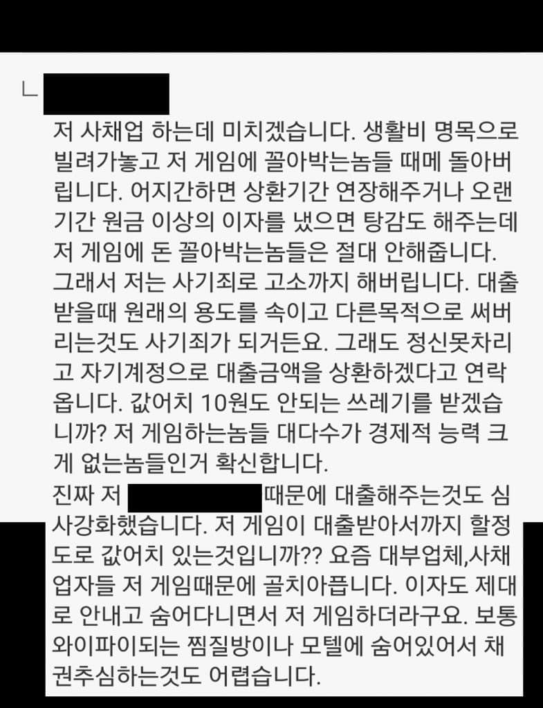 뭐 자기가 번돈 중 여윳돈을 쓰는 것도 아니고 대출은 진짜 이해가 안가네 애초에 저렇게 수백수천만원 질러도 폰겜은 태생이 한계가 너무 명확해서 막상 하루에 일퀘끝내면 할것도 없잖아
