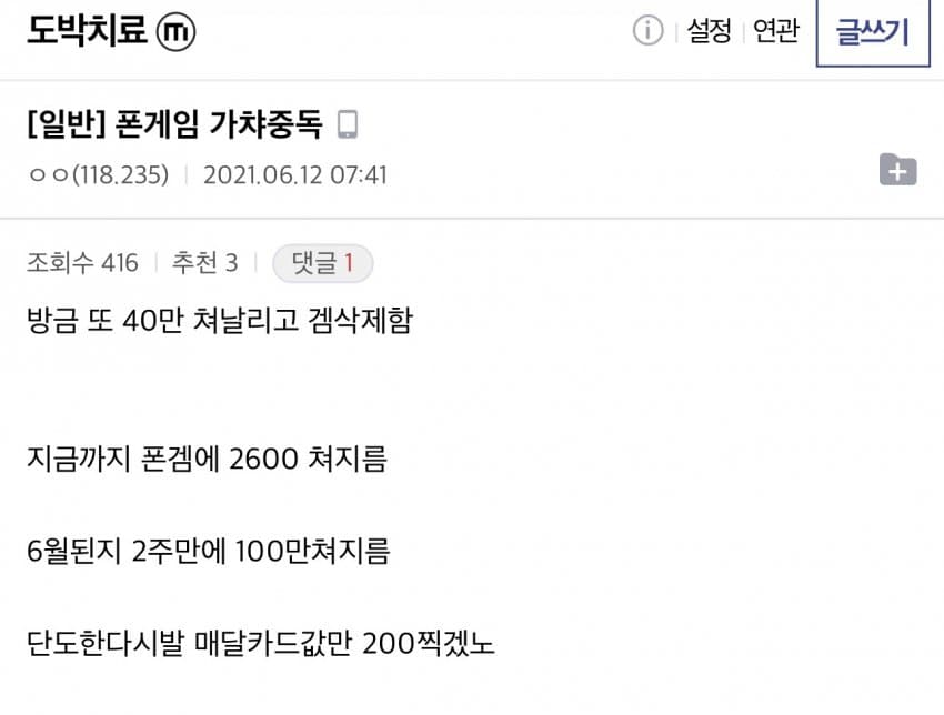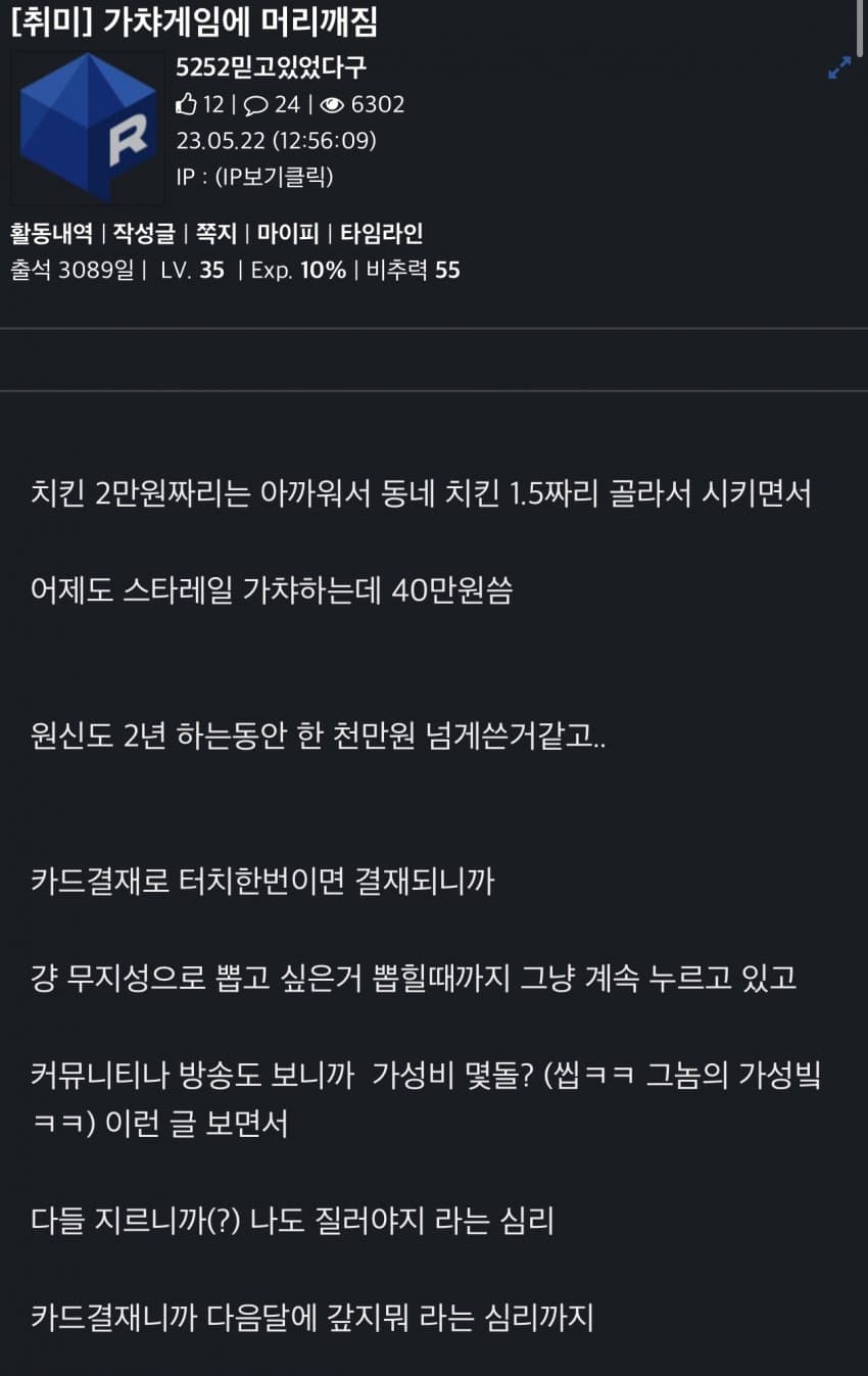 모바일 폰겜 pvp 있는겜 아닌이상 딸깍겜 대부분인데 돈 저렇게 지르는건 가챠+커뮤 중독임, 겜 커뮤 보면 초회까진 무과금이다 이러면서 머리깨진 애들 수두룩함 그런 애들 하는말 보다보면 나도 하면서 지갑 열리는거고
