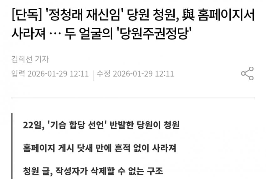 [단독] '정청래 재신임' 당원 청원글 민주당 홈페이지에서 삭제