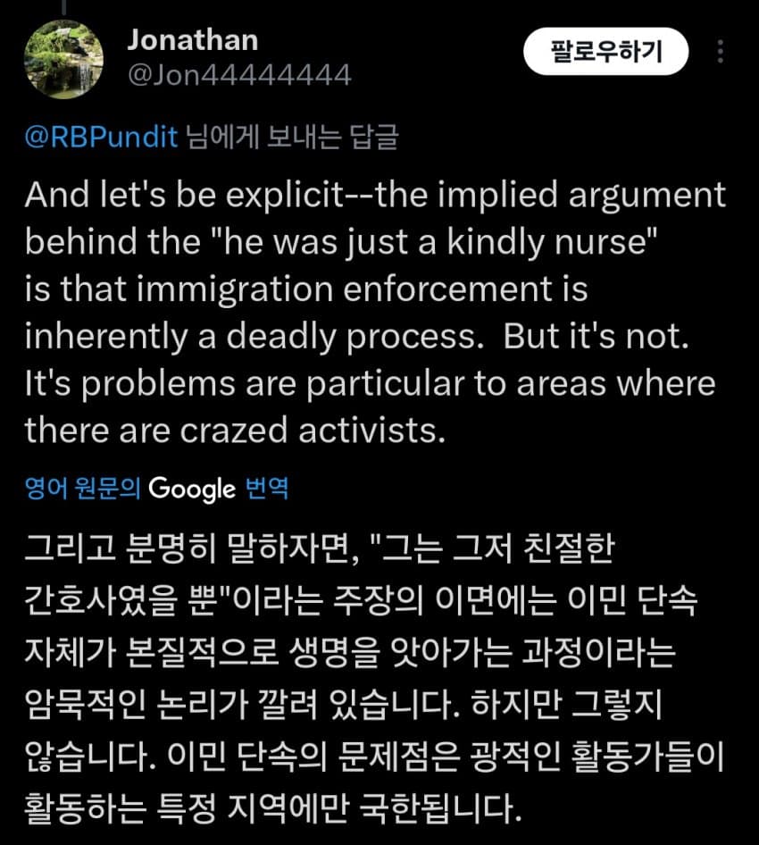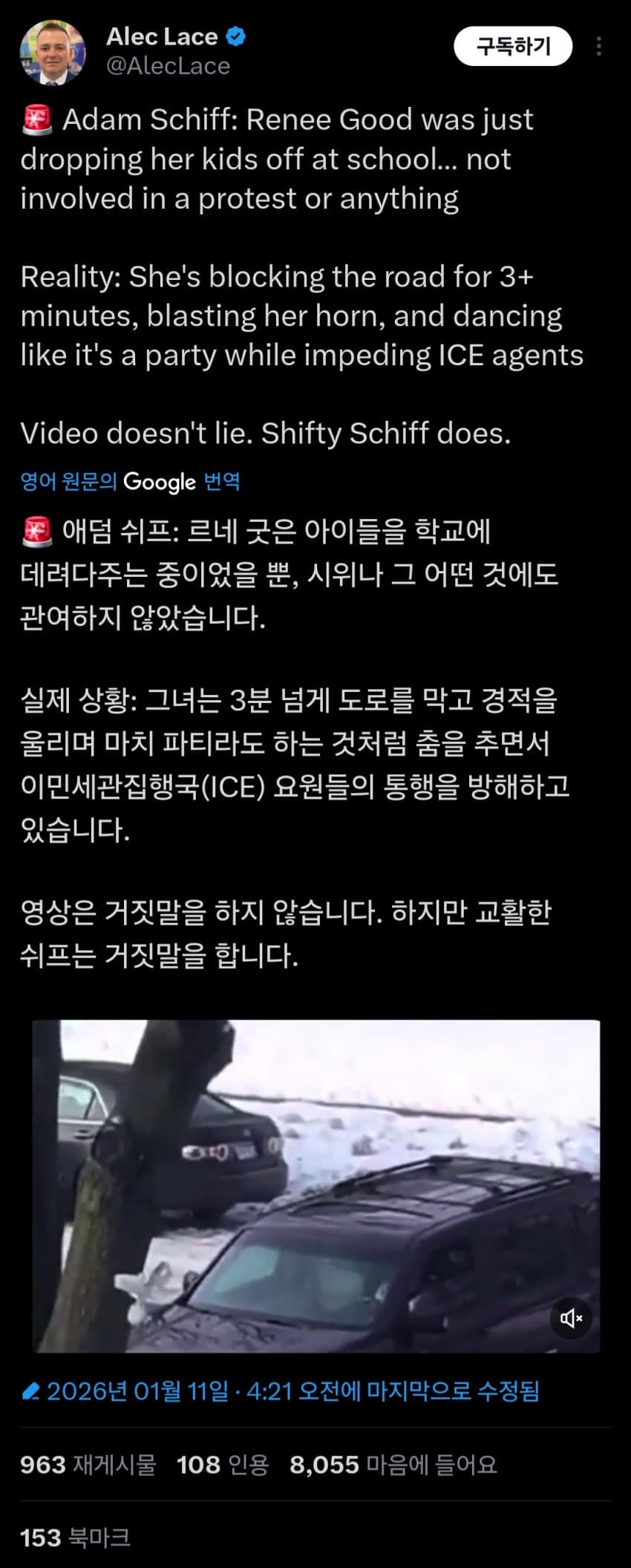 하지만 이후 르네 굿은 불체자 단속을 방해하려는 정치적 목적의식을 가진 채 ICE를 스스로 찾아나선 사람이라는 게 분명해졌고, 지금은 가장 멍청한 좌파들조차 초기의 주장은 포기하게 되었음