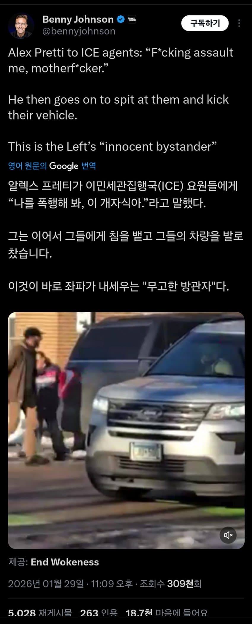 프레티가 ICE 차량을 발로 차서 파손시킨 후