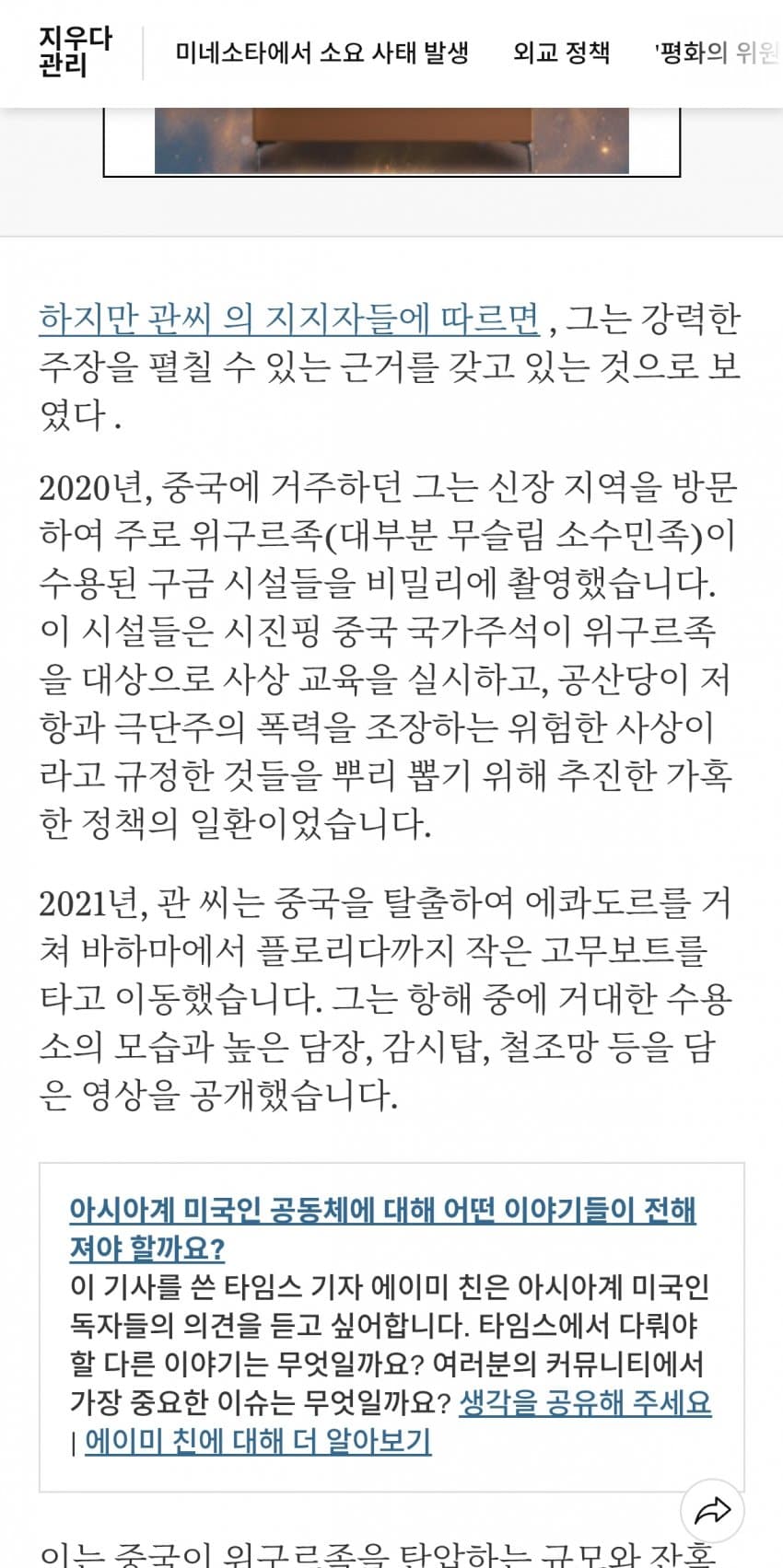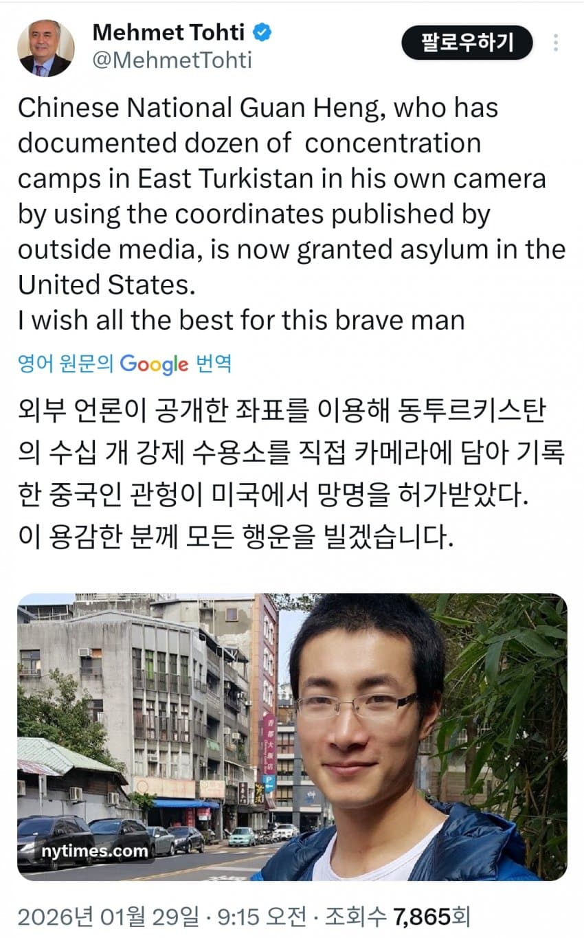 고든 창 "위구르족 강제수용시설 촬영 중국인 미국 망명 허용"