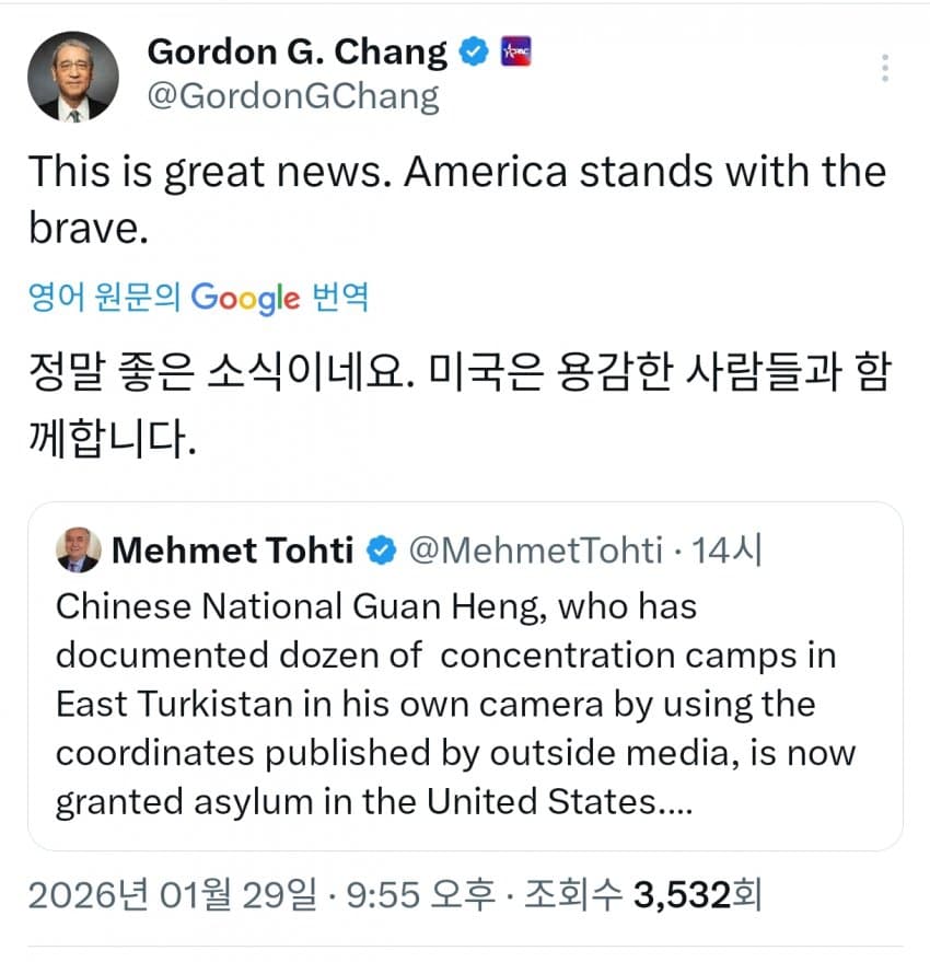 고든창이 트윗해서 저 중국인 고발자의 망명이 허가된 것임