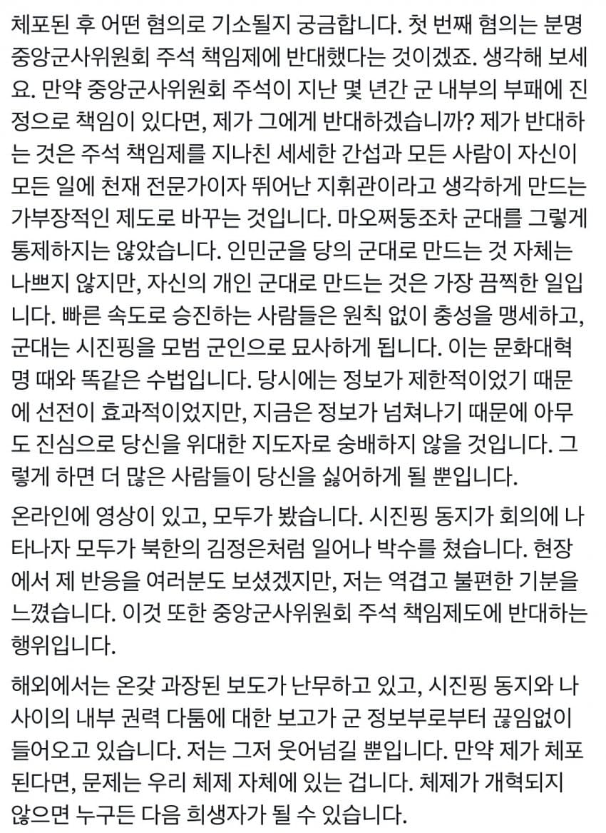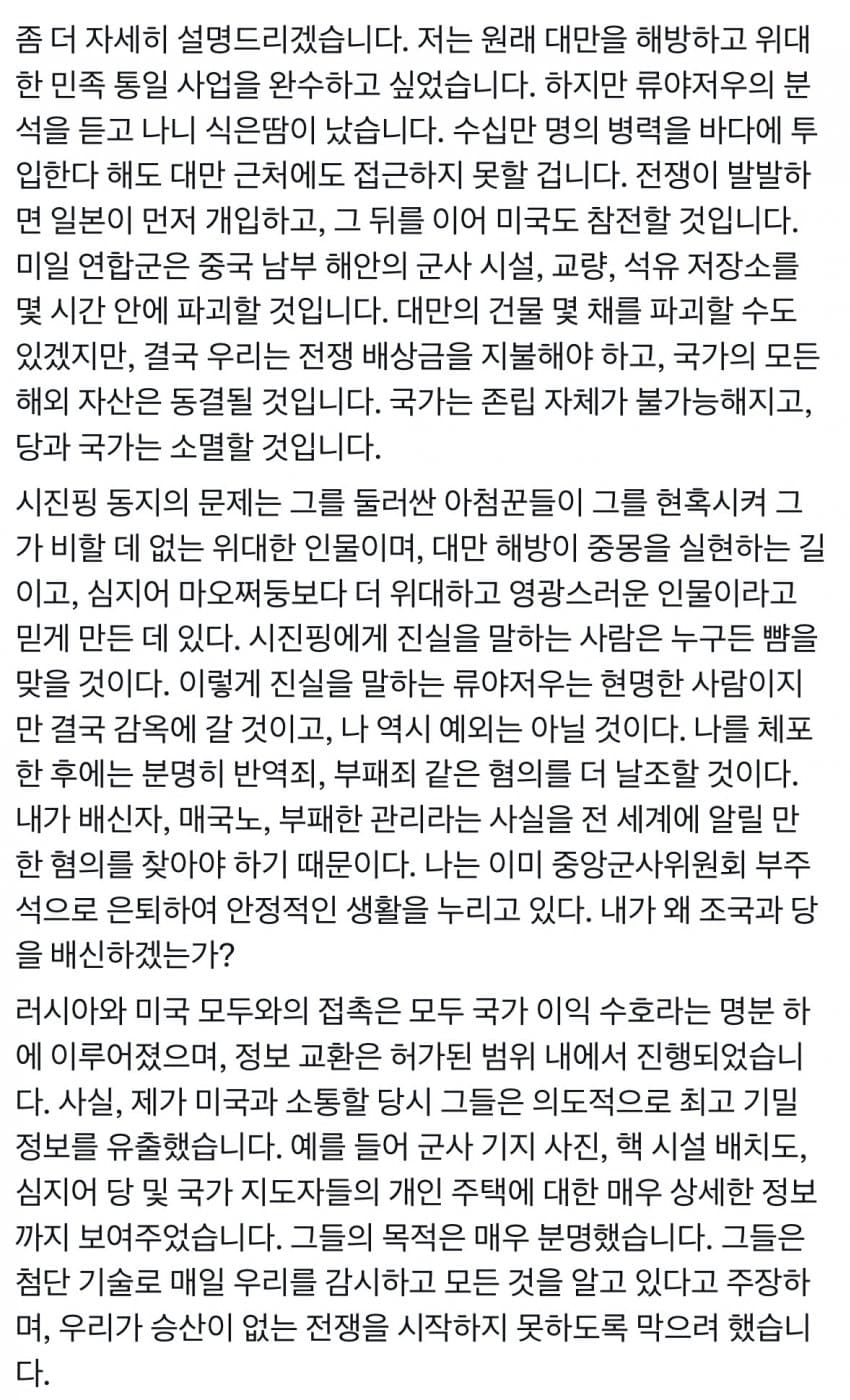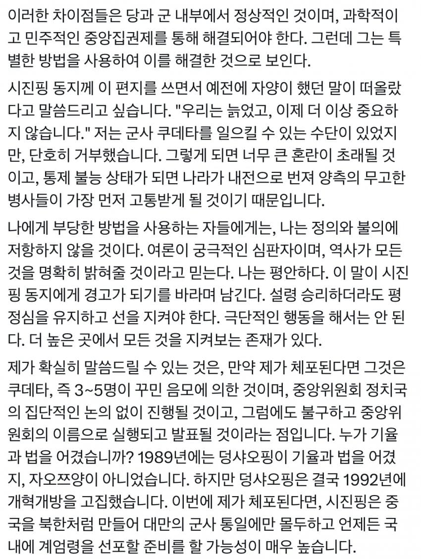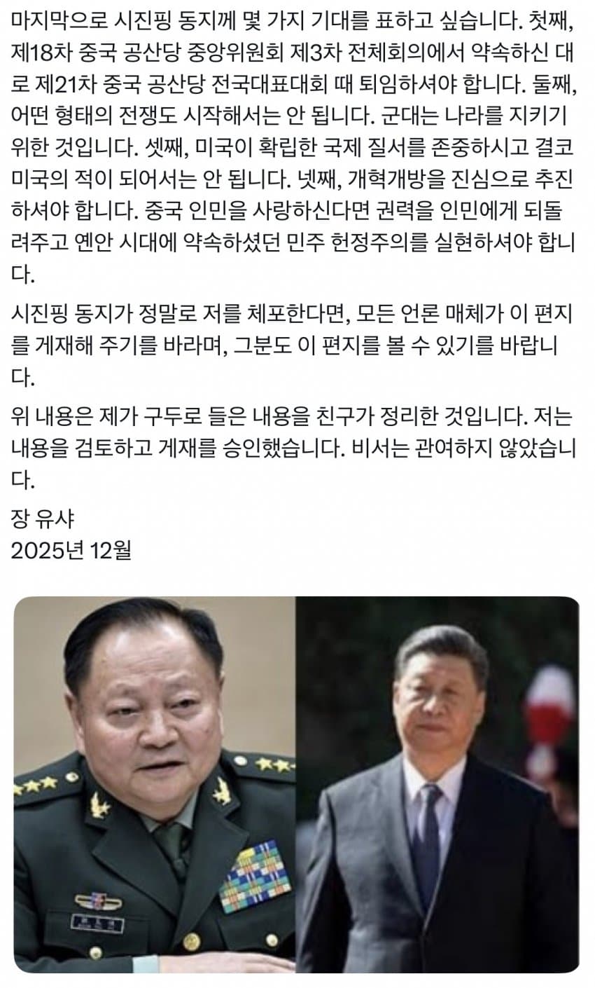 3번때문에 개구라 걍 짱께 네티즌이 그럴듯하게 만든 편지로 보임.얼핏 그럴듯한데 중국 모든 상층부는 친 시진핑이든 반 시진핑이든 미국 아래에 굽혀야된다고 생각하는사람 아무도 없음.왜냐면 그걸 인정하는순간 공산당 이라는 1당 체제가 무너져버리거든
