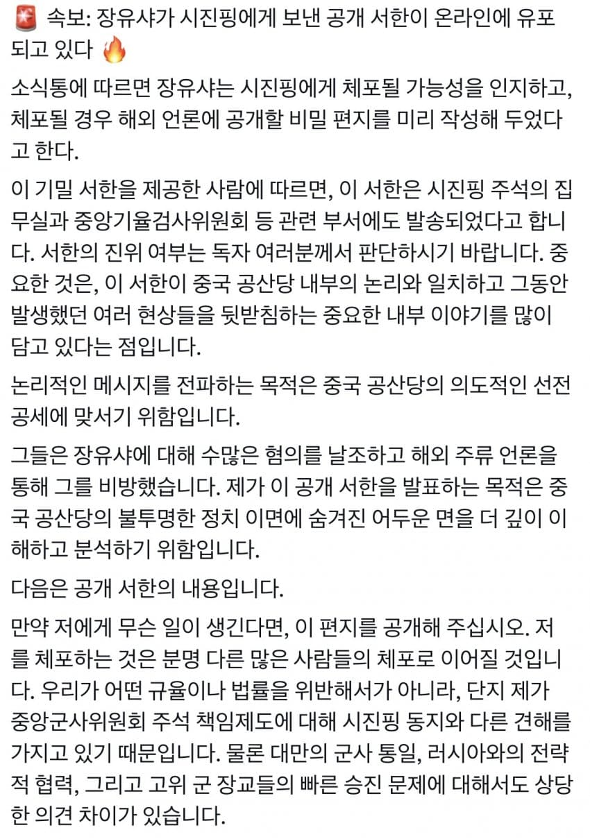 장문) 장유샤 편지 내용 떴음