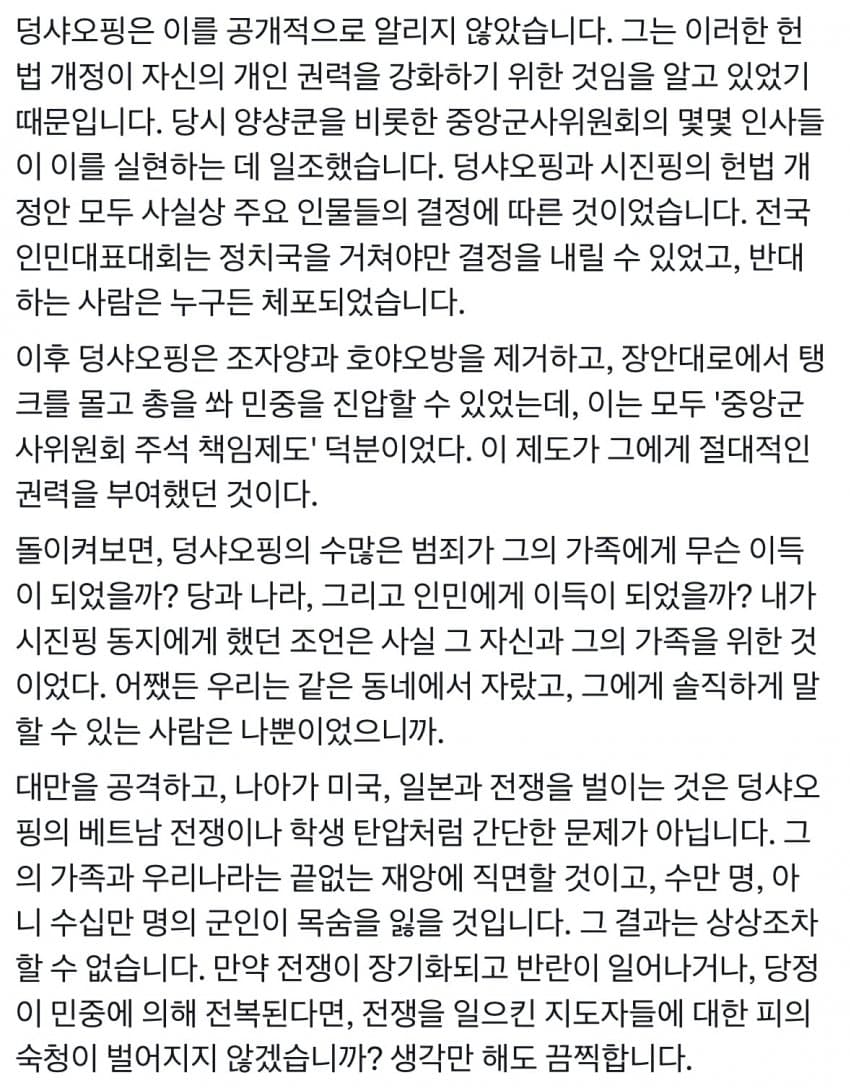 저게 사실이라도 장유샤는 멍청한거야 자신이 옳음을 안다면 손에 피를 묻혀서라도 역사의 올바른 길로 가야지 이제 시진핑의 권력만 강화되고 중국은 더 재앙의 길로 가게 되는거잖아