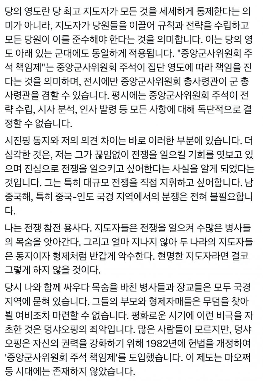 내전 때문에 뒤질 짱개들보다 대만 먹겠다고 설쳐서 뒤질 짱개가 더 많을 거 같은데.진짜 무고한 장병들의 희생을 걱정했다면 차라리 시진핑을 쳤어야 함.저건 그냥 용기와 결단력이 부족했던 사람의 구차한 변명임