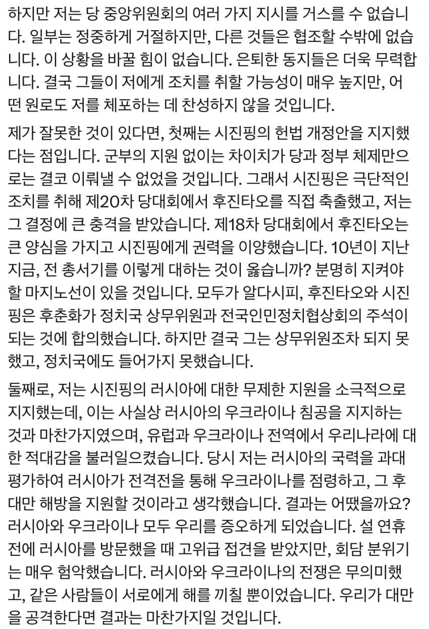 이게 진짜면 주은래 처럼 멋진 인물이네 근데 진핑인 그릇이 안되는 놈인지라 ㅋㅋ 대만치고 푸틴꼴 날듯
