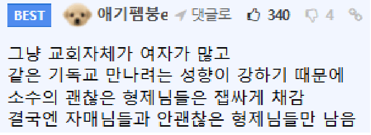 교회를 떠나서 6각형 외모,성격,학력,자산,직업,집안이런 완벽한 남자는 주변 여자들이 가만안둠 20대 후반에 결혼 함 그래서 떨거지들만 남고ㅋㅋㅋ