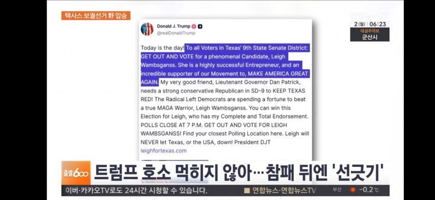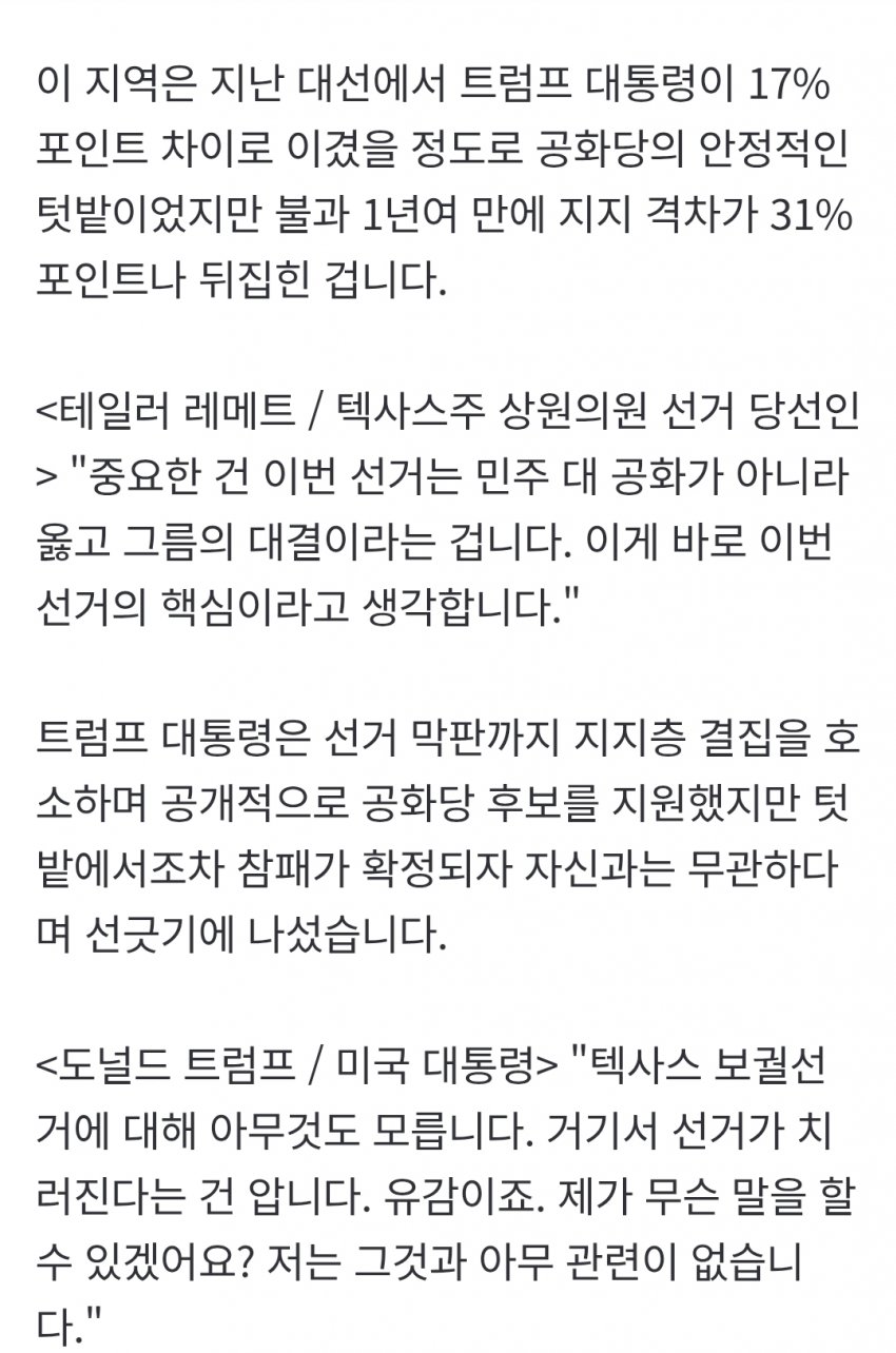개센징 옐로칭총몽키 명예텍사스백인 마가야로들 개발작하는데 텍사스 주상원 선거는 트럼프 지지율 -31% 빠진 건 흐린눈하고 원래부터 민주 강세였던 연방하원 지역구만 죽어라 물고늘어지노 ㅋㅋㅋㅋㅋㅋ