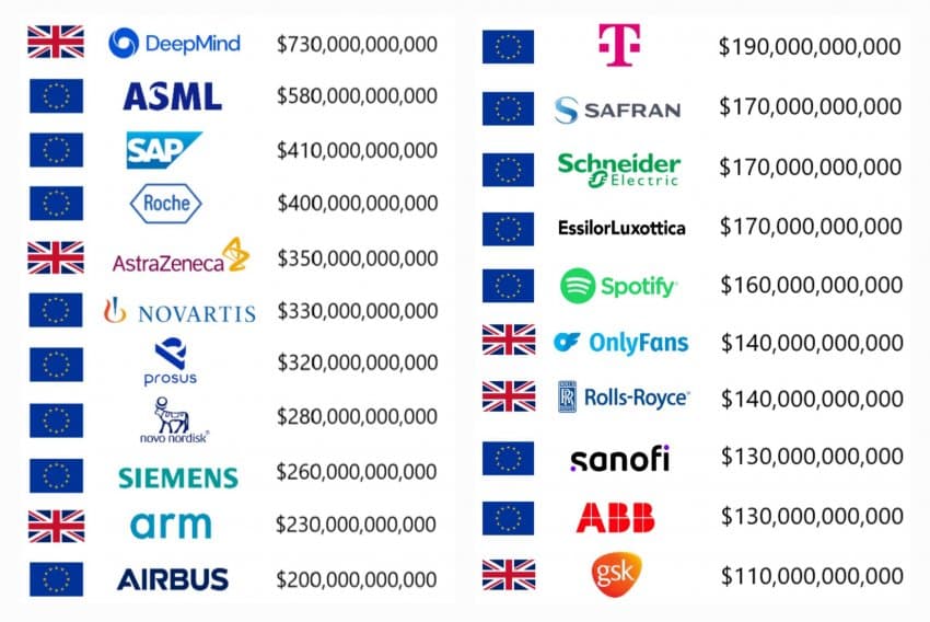 정작 명품산업의 본진인 유럽의 최상위권 기업들을 보면 어느순간부터 명품 기업들은 거의 멸종하고 AI, 반도체, 제약, 항공우주, 소프트웨어 기업들 위주로 다 바뀌었음