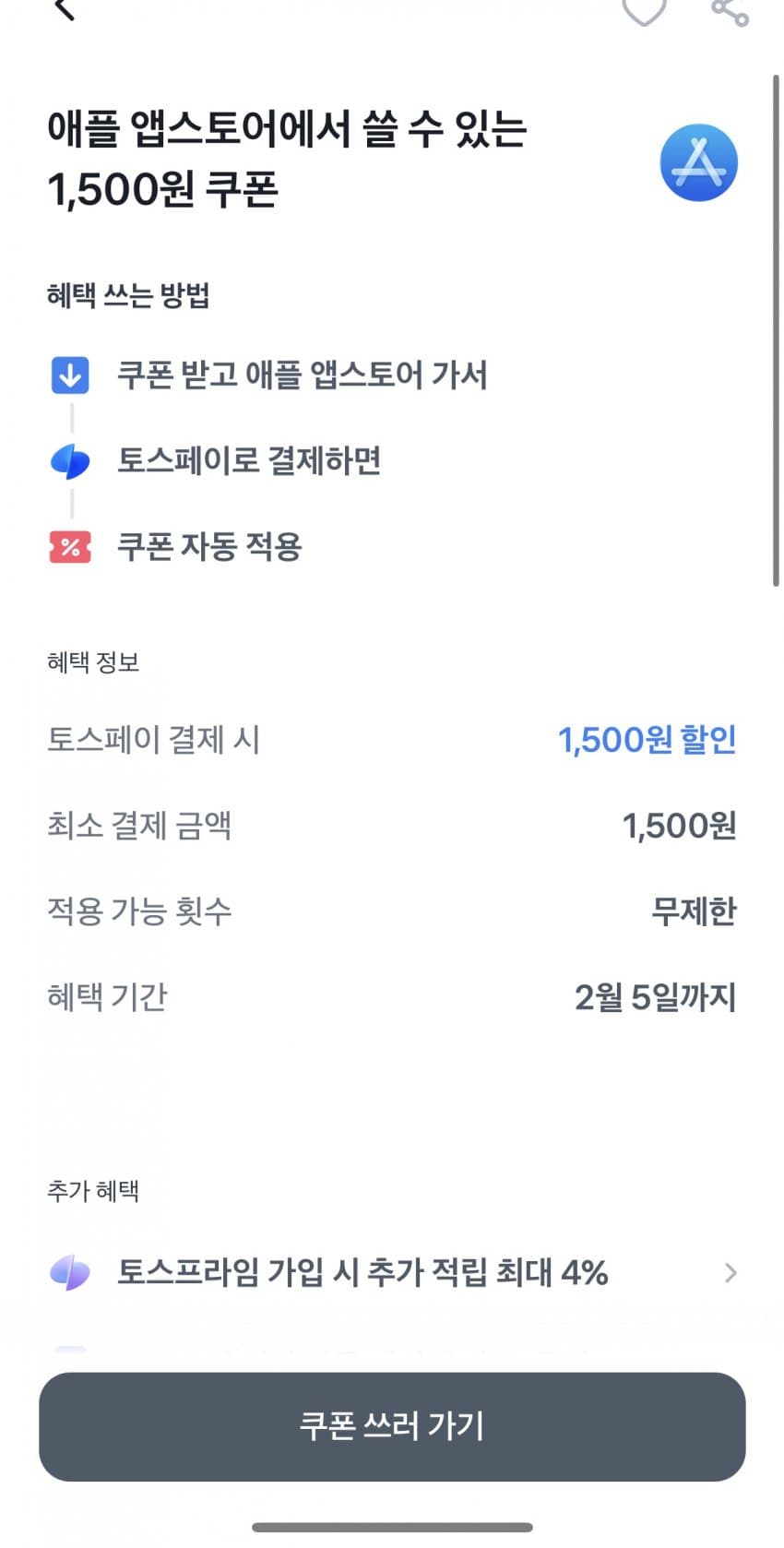 앱스토어 토스 결제수단으로 1500원이상 결제시 1500원 무제한 할인해준댄다