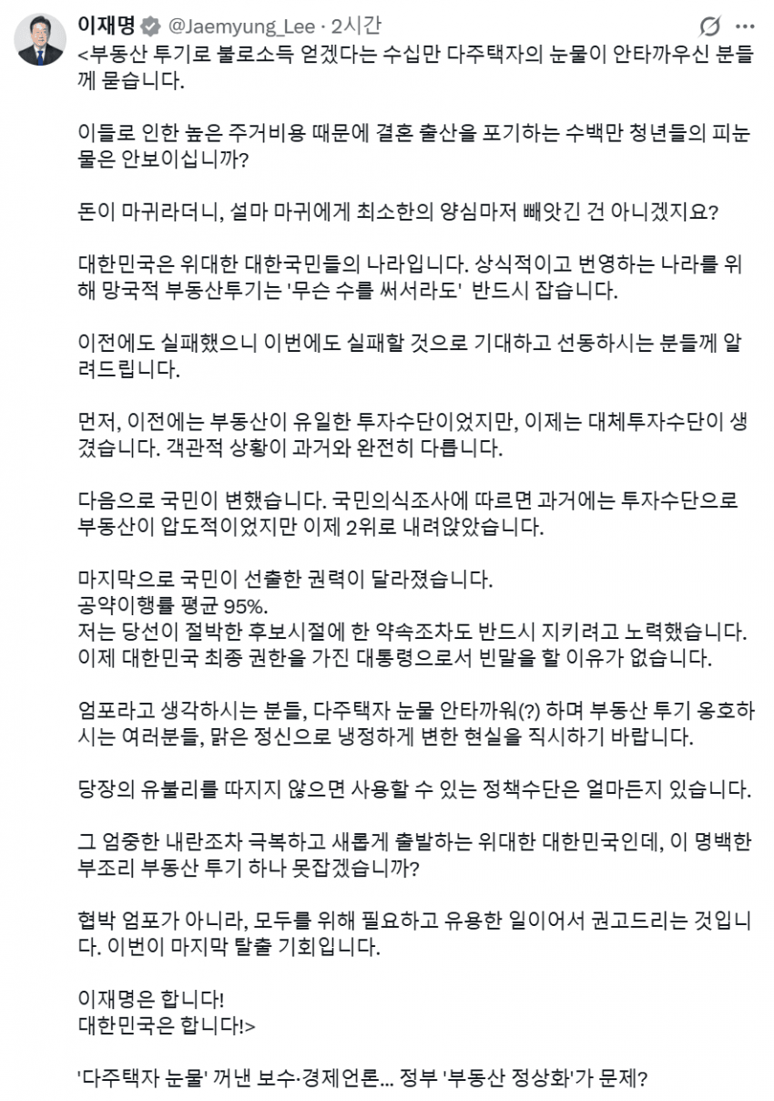 한국경제는 부동산이랑 밀접한 관련이 있다 특히 유동성을 부동산에서 뽑았는데 갑자기 집값을 죽인다? 본인 임기내에서는 절대 못함 해버리면 경제위기옴 ㅋㅋㅋㅋ 다음 대통령이 집값 잡을 수 있게 준비하는 작업정도는 가능함
