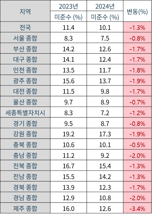 강원도(19.18%) > 전라북도(16.72%) > 제주특별자치도(16.03%) > 광주광역시(15.60%) > 전라남도(15.53%) > 부산광역시(14.23%) > 대구광역시(14.05%) > 경상북도(14.00%) > 인천광역시(13.51%) > 경상남도(12.86%) > 대전광역시(11.54%) > 충청남도(11.20%) > 충청북도(10.58%) > 울산광역시(9.66%) > 경기도(9.54%) > 세종특별자치시(8.32%) > 서울특별시(8.28%)