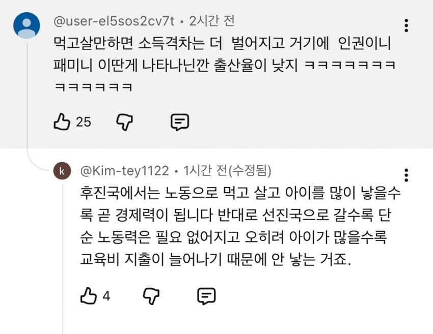 걍 인간은 이세상에 뭐든 남기는걸 좋아함.고소득인 사람들은자녀말고도 본인의 자아실현을 통해 여러가지 분야에서 세상에 내 흔적을 남길 수 있는데저소득층 국가의 사람들은 걍 아이 낳는거 말고 ㄹㅇ 남길게 없으니 아이나 많이 낳고 보는거다이게 머리 속으로는 본인들도 인지는 안하지만 본능처럼 깔려있는거임