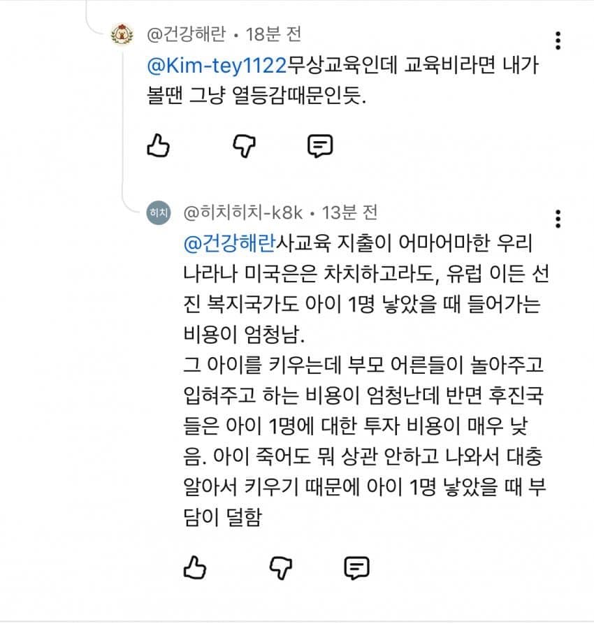 반면에 선진국으로 갈수록 사회인으로서 요구되는 능력치가 기하급수적으로 높아지니까 교육비를 위시한 모든 자녀 양육비용이 개 미친듯이 비싸짐 그러니 안 낳음