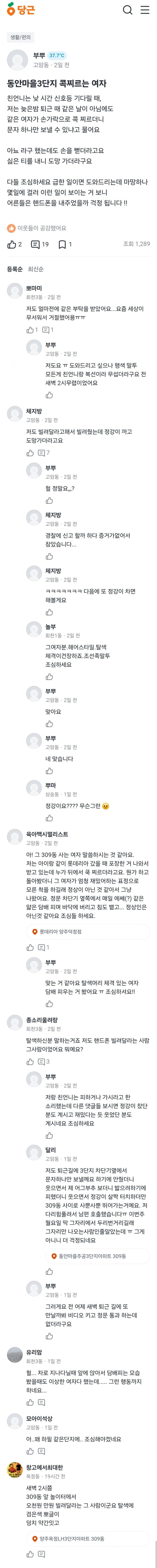 1) 양주 고암동에서 체격 크고 담배 피는 여자가 행인들 손가락으로 콕콕 찌르면서 자꾸 누군가한테 문자 하겠다고 폰 빌려달라함
