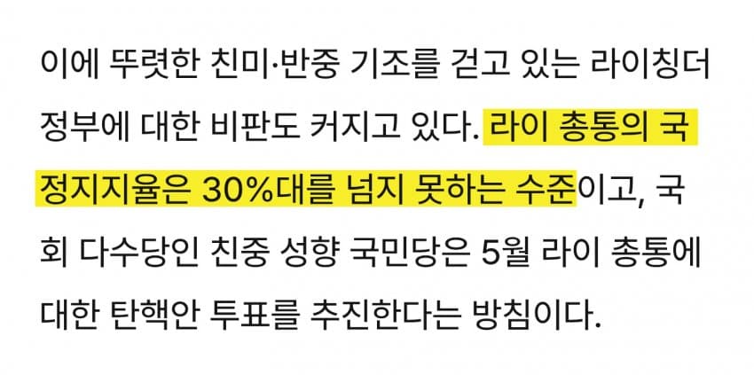 라이칭더 본인은 무리하게 야당을 탄압하다가 탄핵 위기