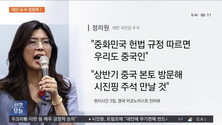 이런 가운데 친중 성향의 제1야당 국민당의 정리원 주석은 한 인터뷰에서 "우리도 중국인"이라고 강조하며, 상반기에 중국을 방문해 시진핑 국가주석을 만나겠다고 밝힘