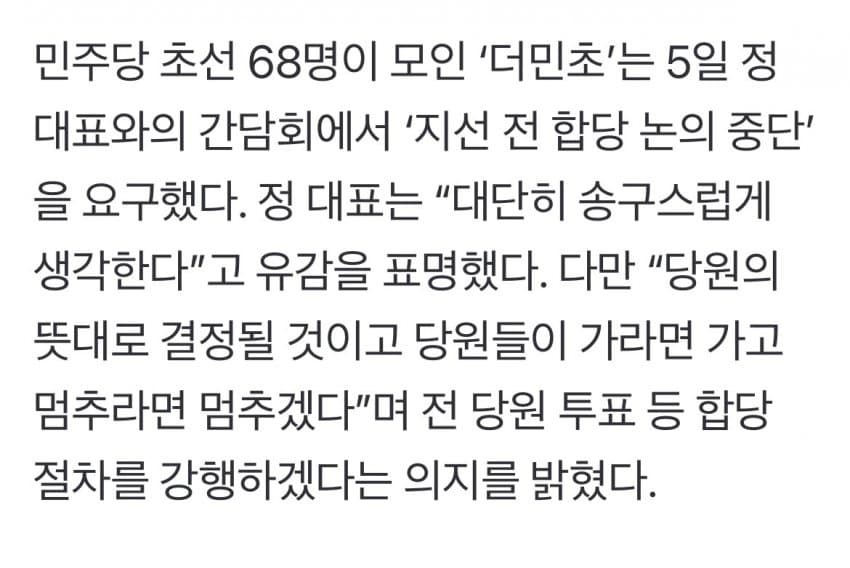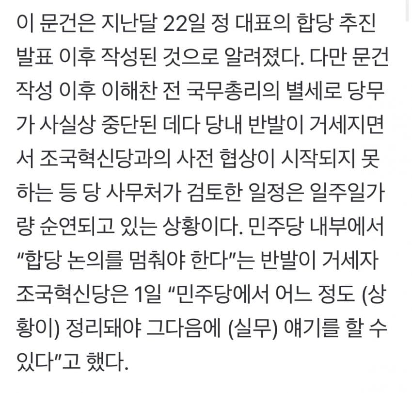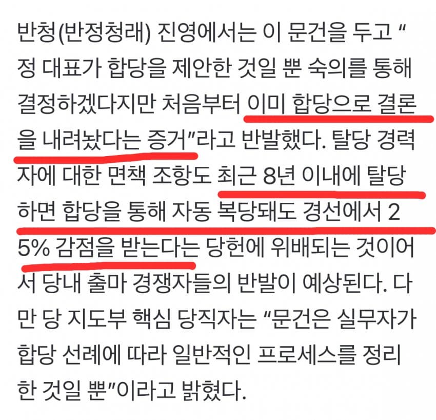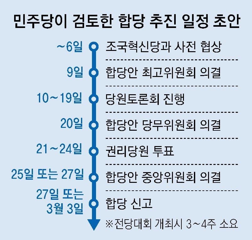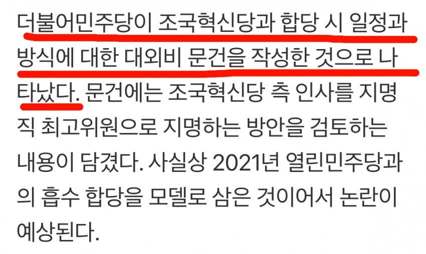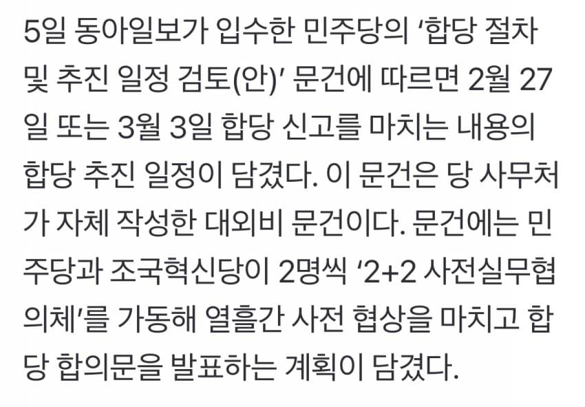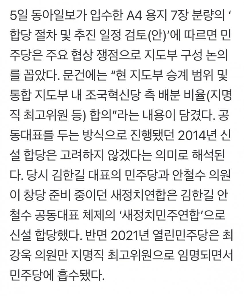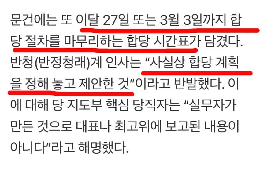 당 지도부 핵심 당직자는 “문건은 실무자가 합당 선례에 따라 일반적인 프로세스를 정리한 것일 뿐”이라고 밝혔다.일단 문서가 거짓이거나 작성을 부정한 건 아니네