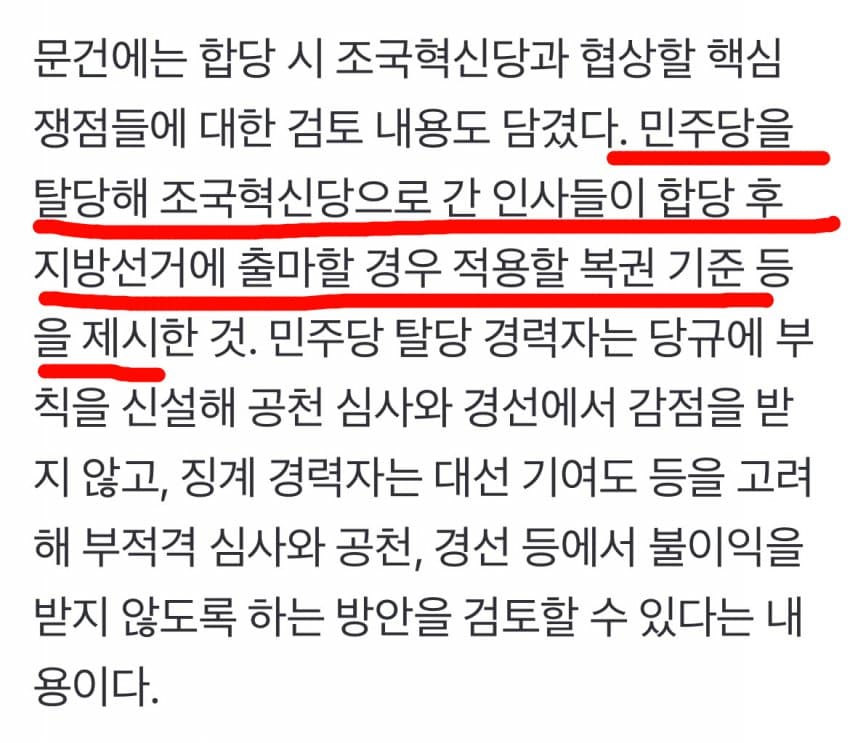 민주당을 탈당해 조국혁신당으로 간 인사들이 합당 후 지방선거에 출마할 경우 적용할 복권 기준 등을 제시한 것. 민주당 탈당 경력자는 당규에 부칙을 신설해 공천 심사와 경선에서 감점을 받지 않고, 징계 경력자는 대선 기여도 등을 고려해 부적격 심사와 공천, 경선 등에서 불이익을 받지 않도록 하는 방안을 검토할 수 있다는 내용이다