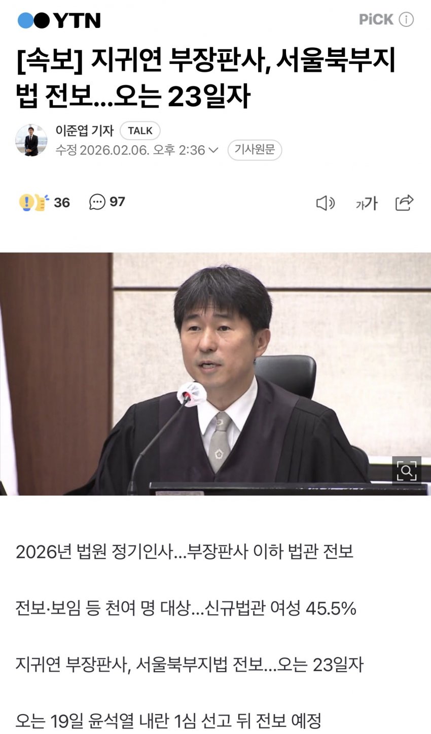 부장판사 포함 판사 인사권자는 대법원장 아님? 현직 대법원장은 그 희대의 조씨 그분인데? 지귀연의 의사가 반영되어 전보?! 유배가 아니라 특혜성 전보같은데? ㅋㅋ