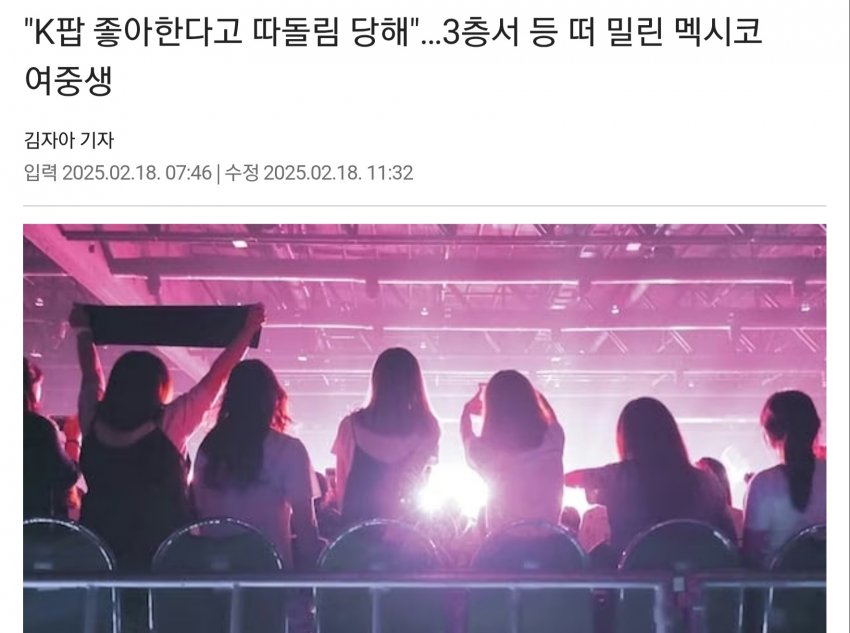 한류 붐이 강한 국가 중 하나인 멕시코에서 한 여중생이 K팝을 좋아한다는 이유로 동급생에게 따돌림 피해를 본 것으로 알려져 논란이 일고 있다. 현지 교육·수사당국은 경위 조사에 나섰고, 현지 한류 팬클럽은 가해자에 대한 엄벌을 촉구하고 있다.17일(현지시간) 멕시코시티 검찰청 등에 따르면 지난 4일 멕시코시티 이스타팔라파 지역에 있는 한 중학교에서 13세 여학생이 3층 높이에서 급우들의 강요에 못 이겨 1층으로 몸을 던졌다는 신고가 접수됐다. 파티마 사발라라는 이름의 이 학생은 현재 인근 병원에서 치료받고 있다