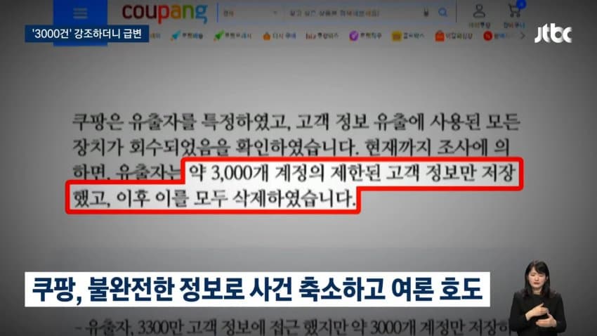 쿠팡은 "3000건만 유출됐다고 말한 적은 없다"는 입장이지만, 불완전한 정보로 사건을 축소하고 소비자를 호도했단 비판이 나옴