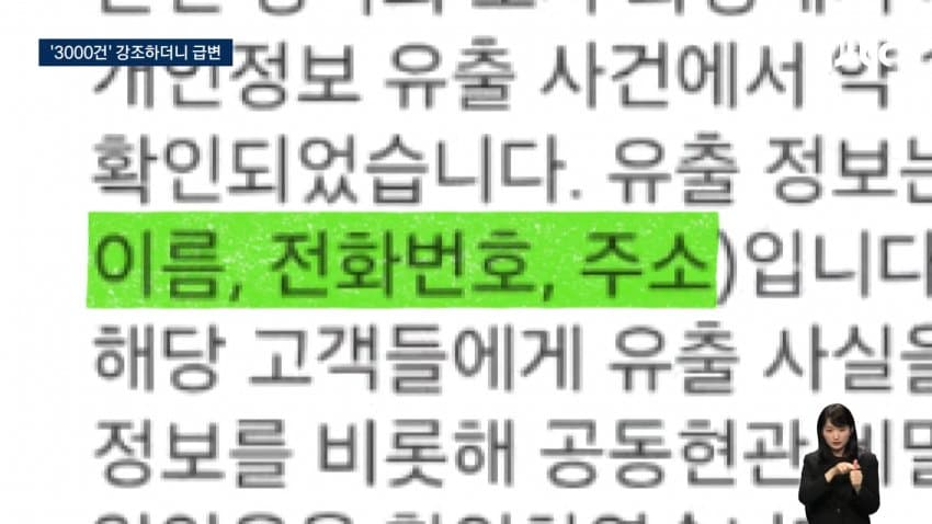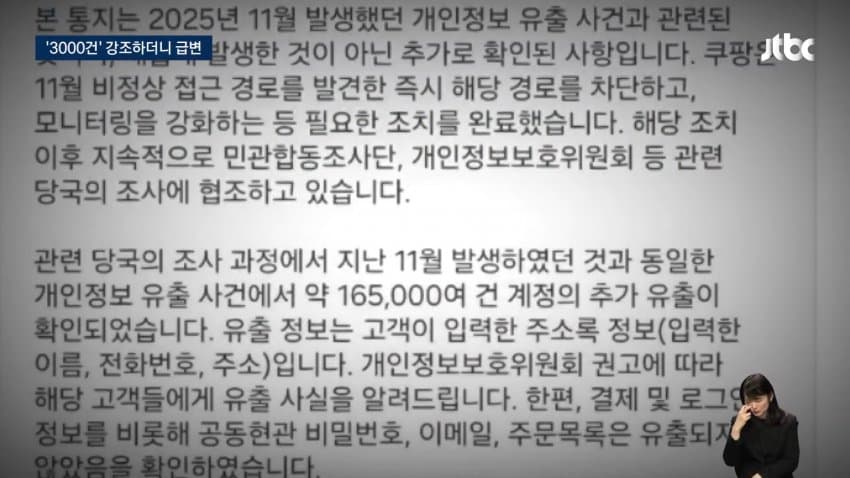 그런데 '3000건 저장'만 강조하던 쿠팡이 16만5000건 추가 유출이 밝혀지자, 태도를 바꿨음