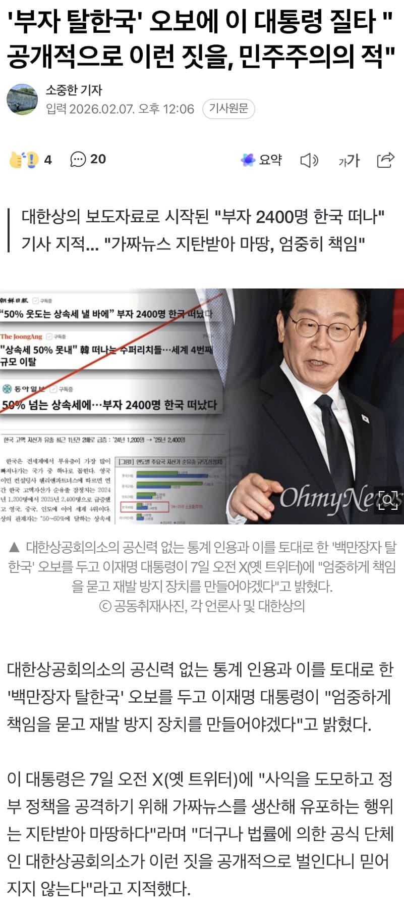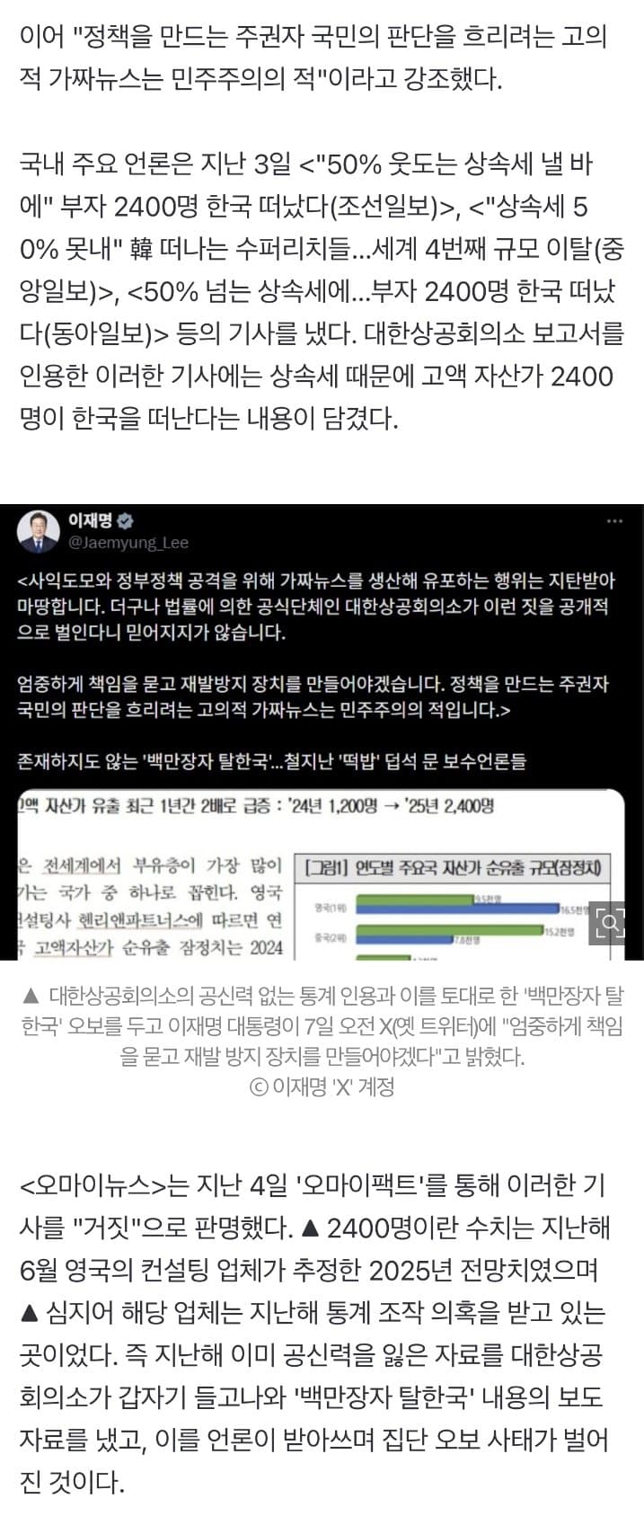 ‘부자 탈한국’ 오보에 이재명 “공개적으로 이런 짓을, 민주주의의 적”