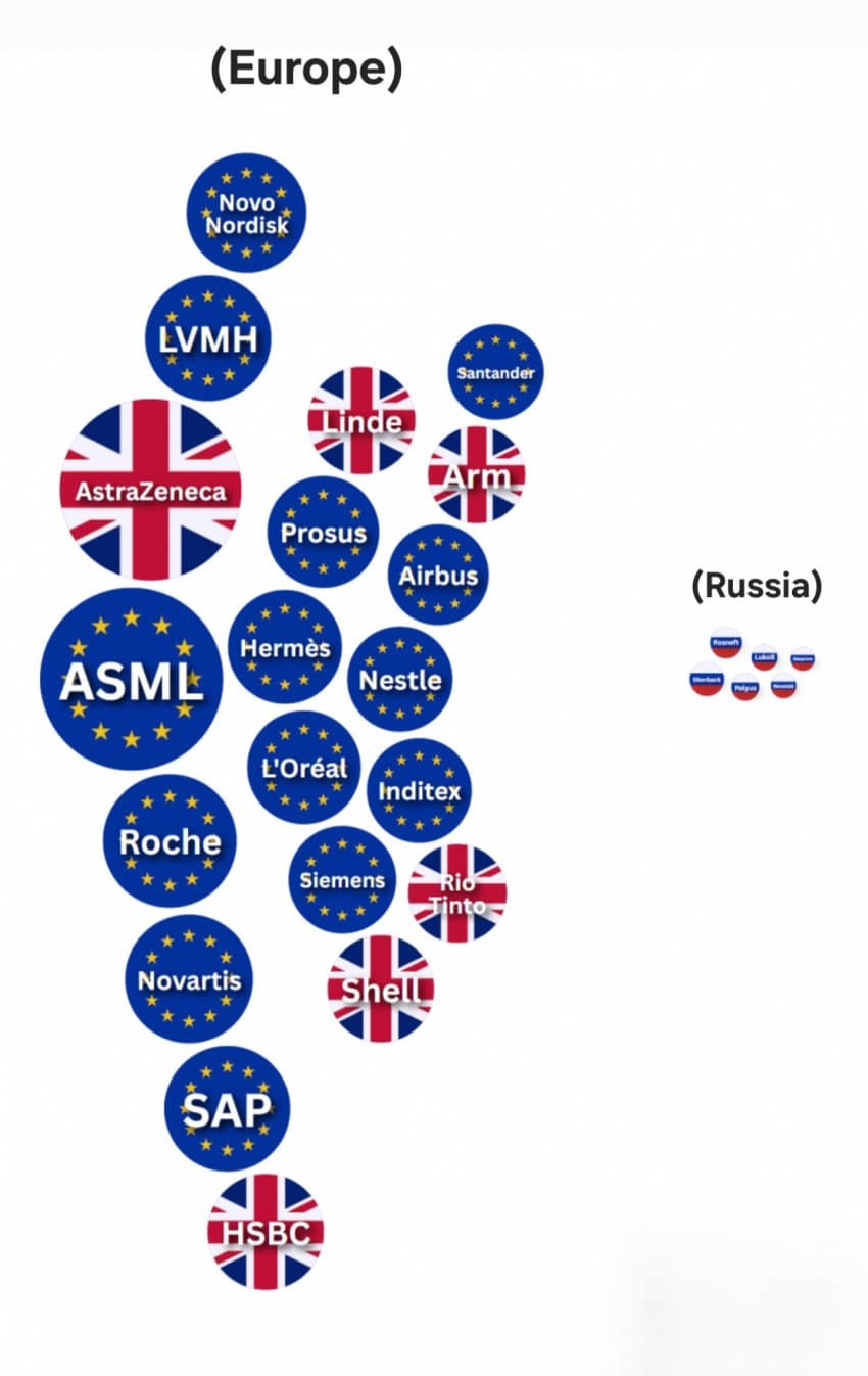 실제로 옆동네 유럽이 지난 30년간 반도체, 생명공학, 소프트웨어, 금융, 명품 등 고부가가치 산업의 거대 기업들을 키워낼동안 러시아는 아무런 기업도 만들어내지 못했음