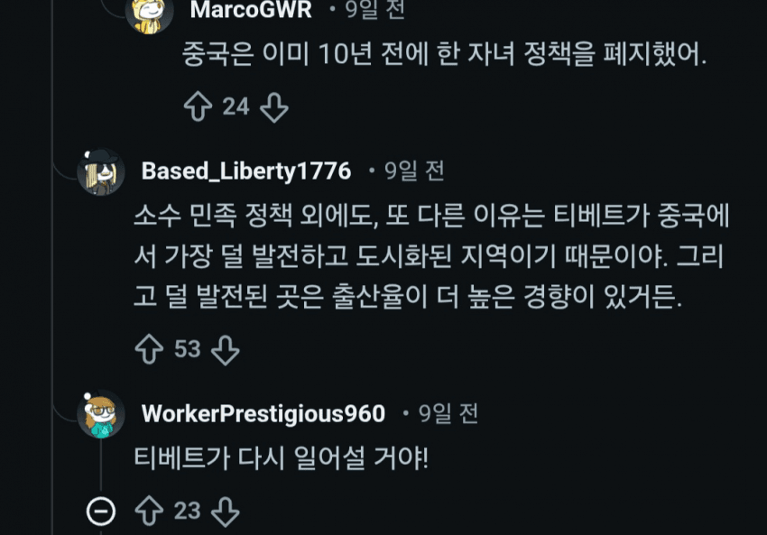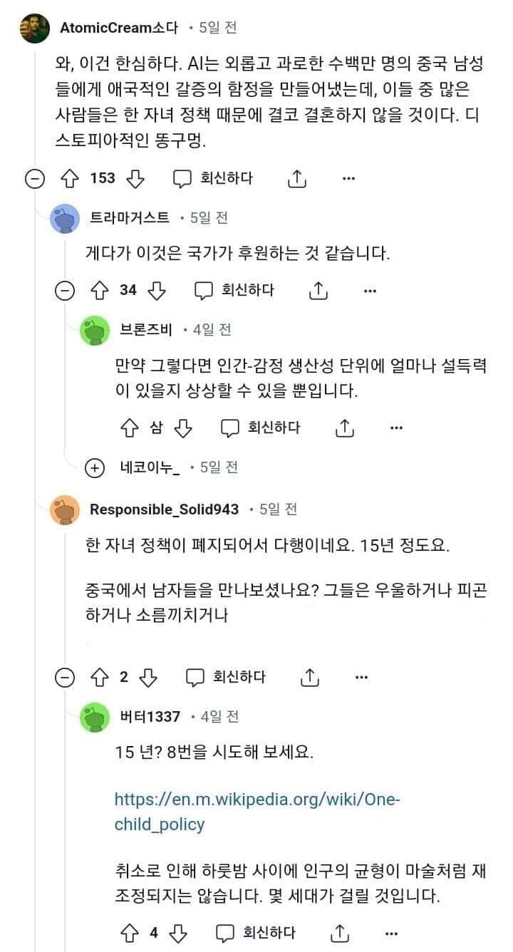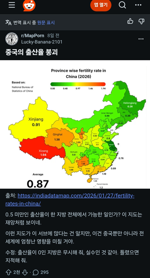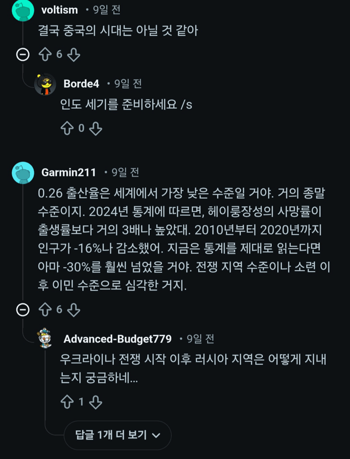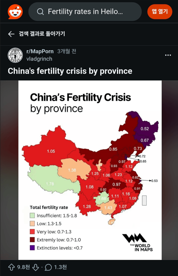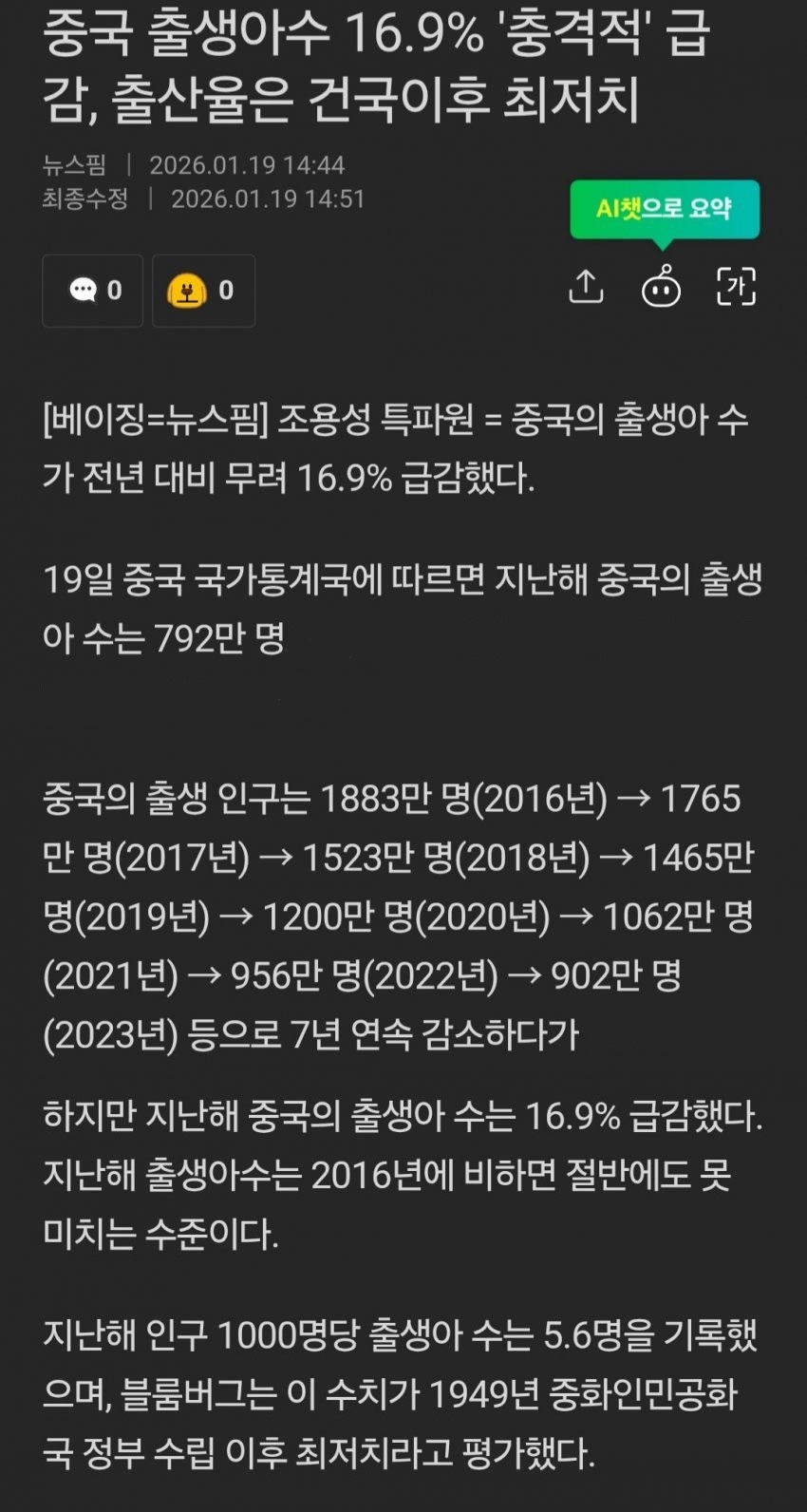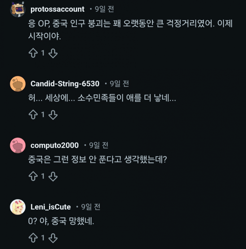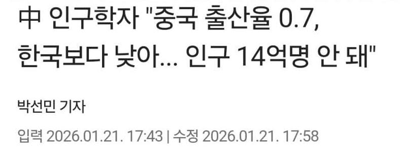 자칭 페미니즘 없고, 젠더갈등 없고, PC주의 없고, 국가에 대한 자부심이 강하다는짱꼴라 시나징 합계 출산율 0.7명2016년 중국 출생아 1,800만명 → 2025년 중국 출생아 792만명, 10년 사이 1,100만명 감소2036년이면 중국 시나징은 미국 출생아 숫자보다도 적어짐 wwww