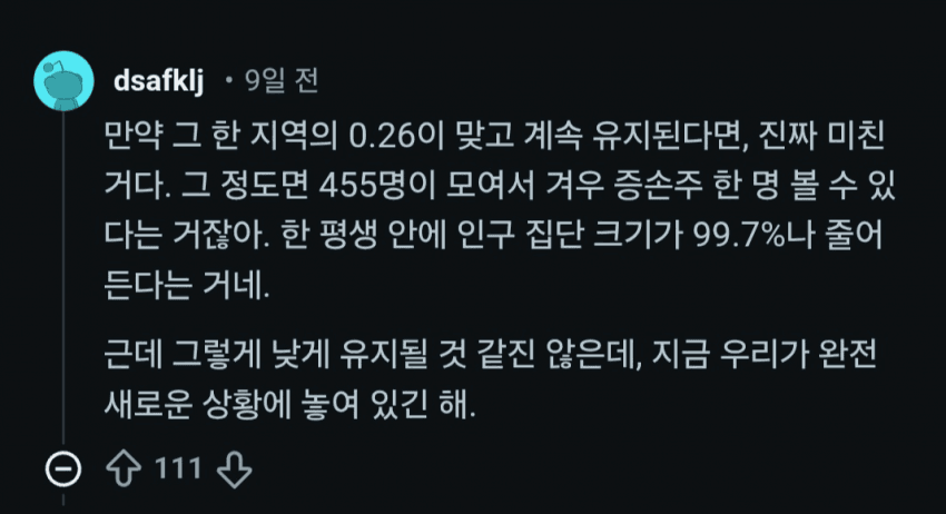 인구수가 계속 유지되는데 필요한 출산율은 약 2.2임(2가 아니라 왜 2.2냐면 죽는 사람을 감안한 수치임)근데 0.26이라는 수치는 한 세대(약 30년)만에 인구수가 11.7%로 줄어든다는 뜻이고두 세대만에 인구수가 1.521%로 줄어든다는 뜻임한 국가의 인구수가 1억명이면 30년만에 1170만명, 60년만에 152만명이 된다는 소리지