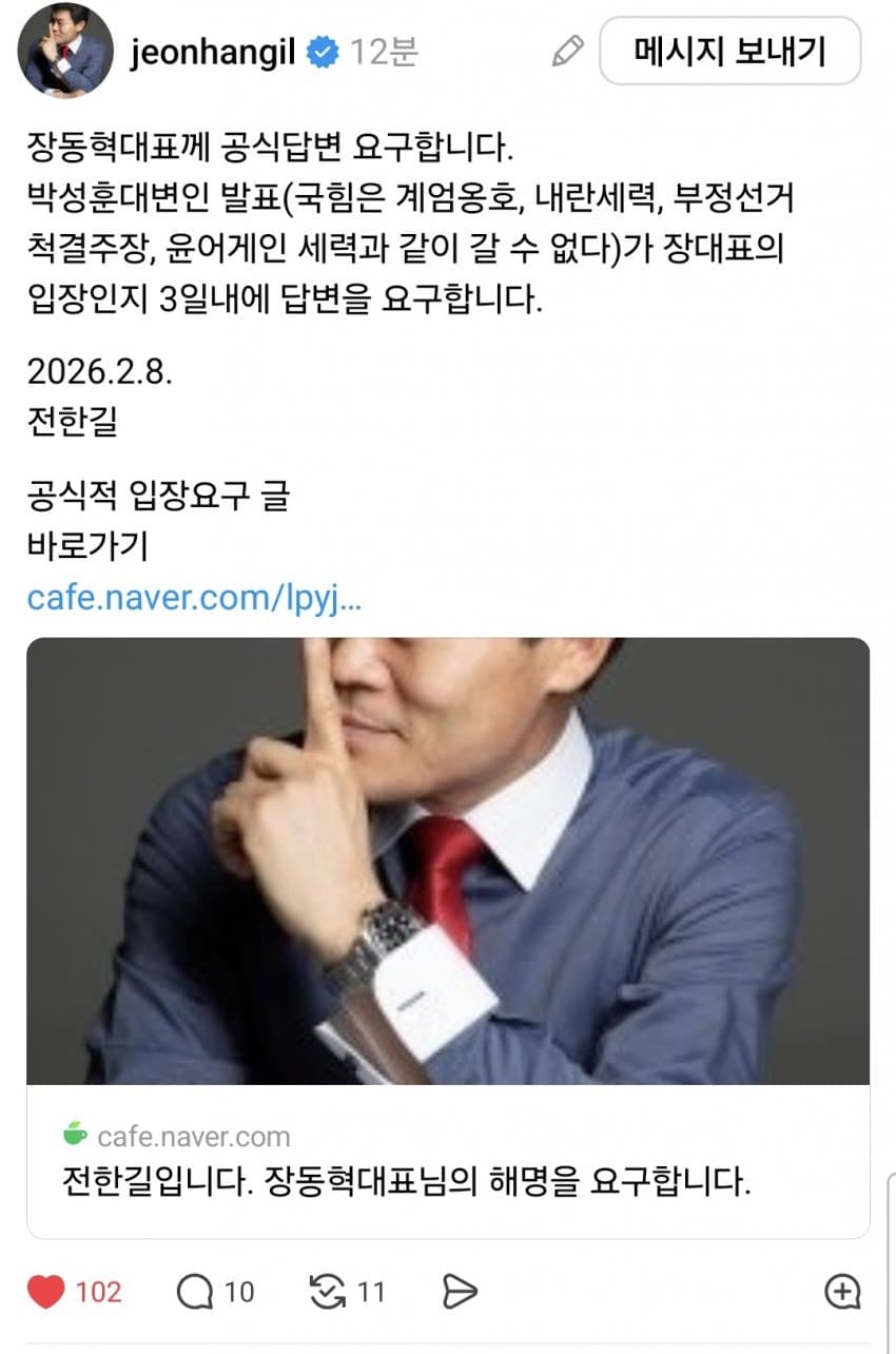정치뽕에 취해서 돌아버렸지평생 한국사 강사나 하다가 공무원 거품꺼지면서 강사들 다들 떠나고 본인도 강사퇴물 되기 직전이었는데갑자기 석열이 탄핵코인 타서 분위기 쏠리고 사람들이 빨아주니까 정신이 돌아버렸지..자기 뭐라도 되는줄 알고, 야당 당대표한테도내가 꼴뵈기 싫은 인간 날려~ 안 날리면 니 운명도 알지? 요런 협박까지 하는 수준까지 옴. 정치뽕에 취해서 미쳐버렸음정치뽕 1년 남았다 본다. 1년 지나면 전광훈처럼 변해서 탑골 공원에서 할배들 앞에서 저지랄 하고 있을거다