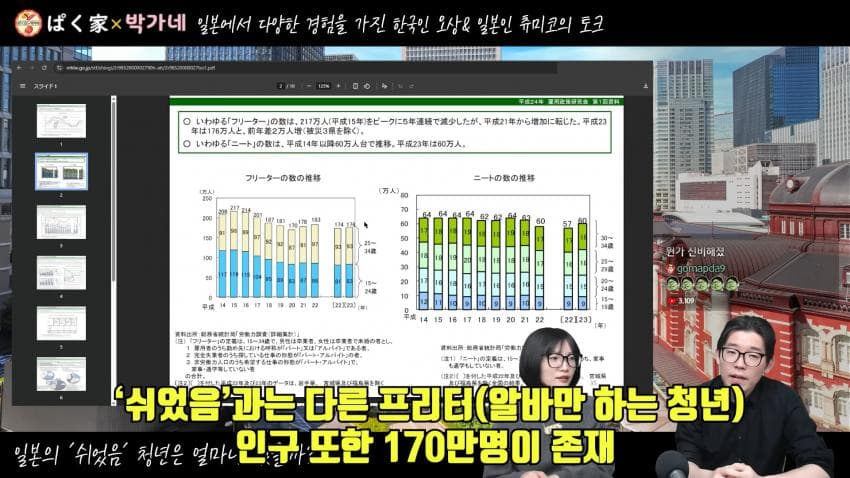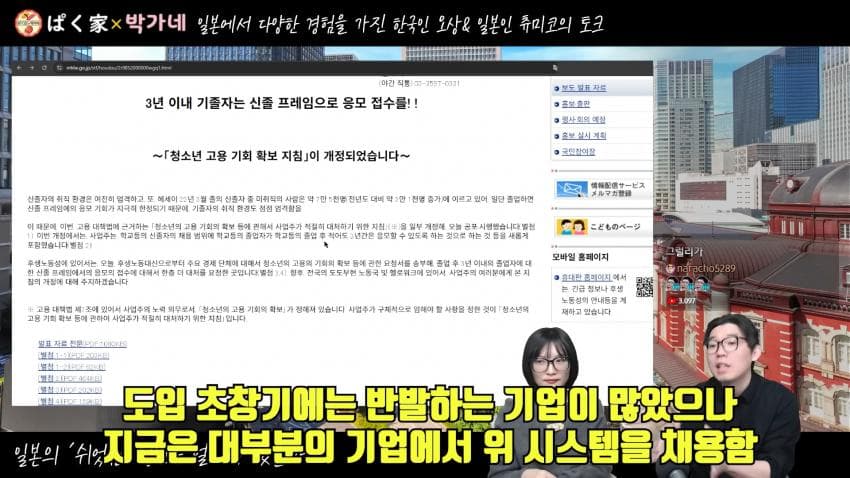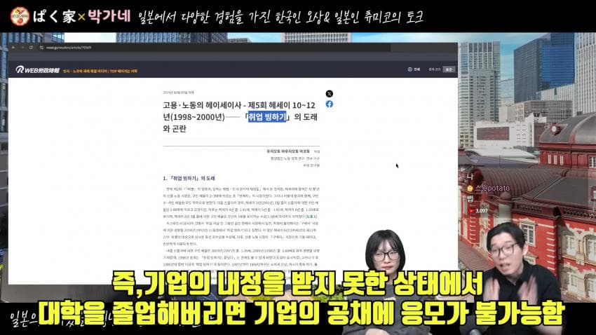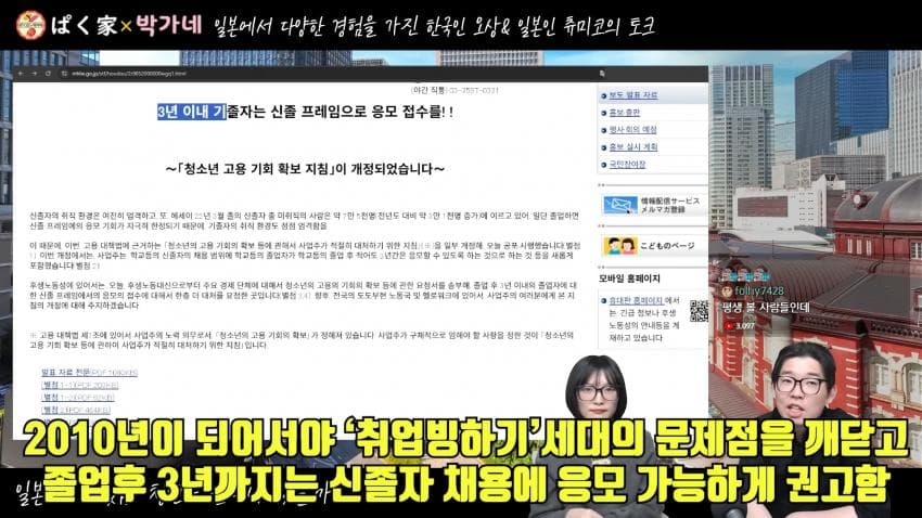 일본의 취업빙하기 세대는 1993에서 2004년까지로 지금과는 전혀 관련이 없다. 일본에서 히키코모리가 대량으로 발생하는 세대가 바로 이 세대. 로제네라고도 불린다. 박가네는 얼굴 까고 활동하는 유튜브로써 굳이 국내에 이삼십대의 원망을 살 필요가 없다