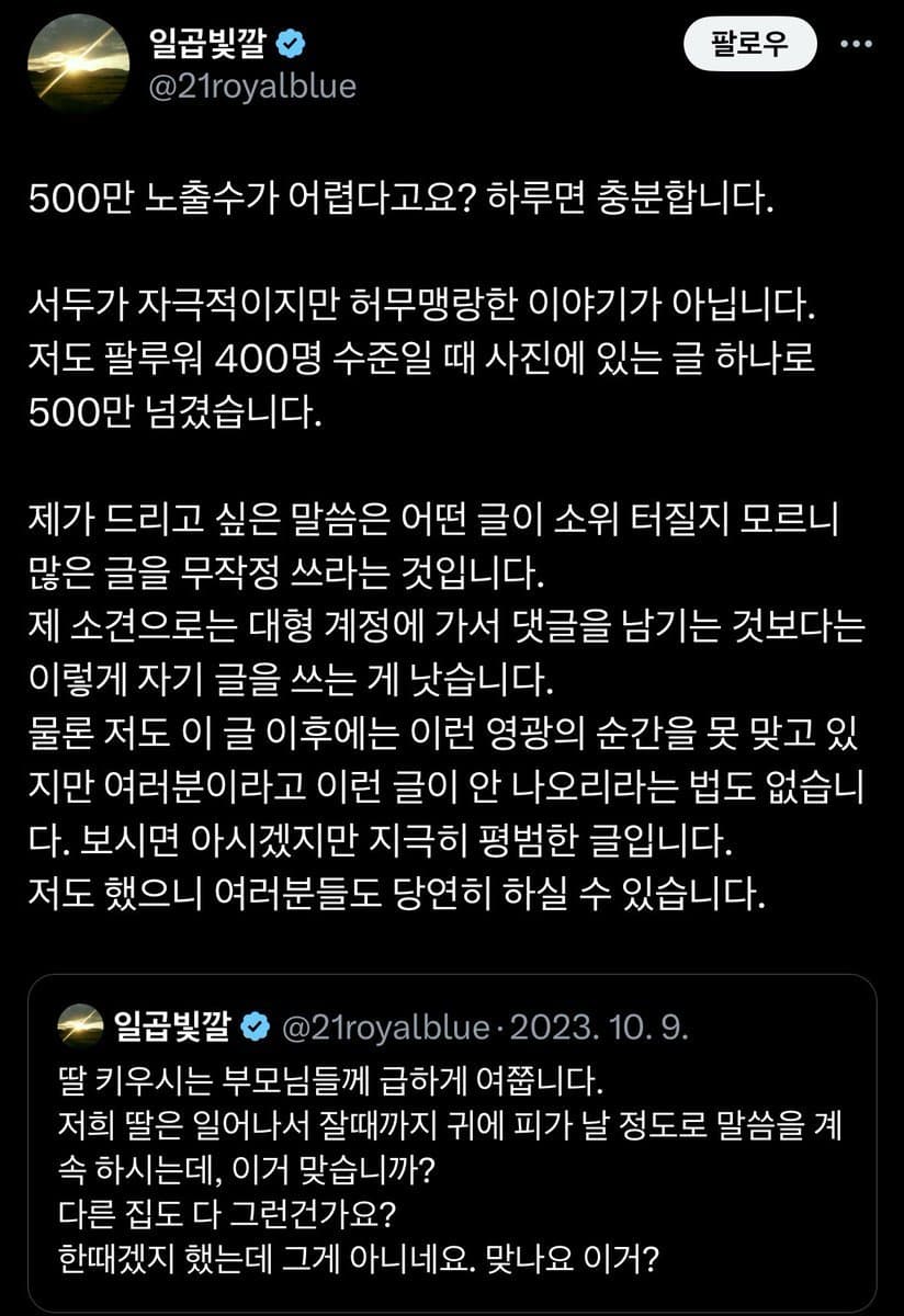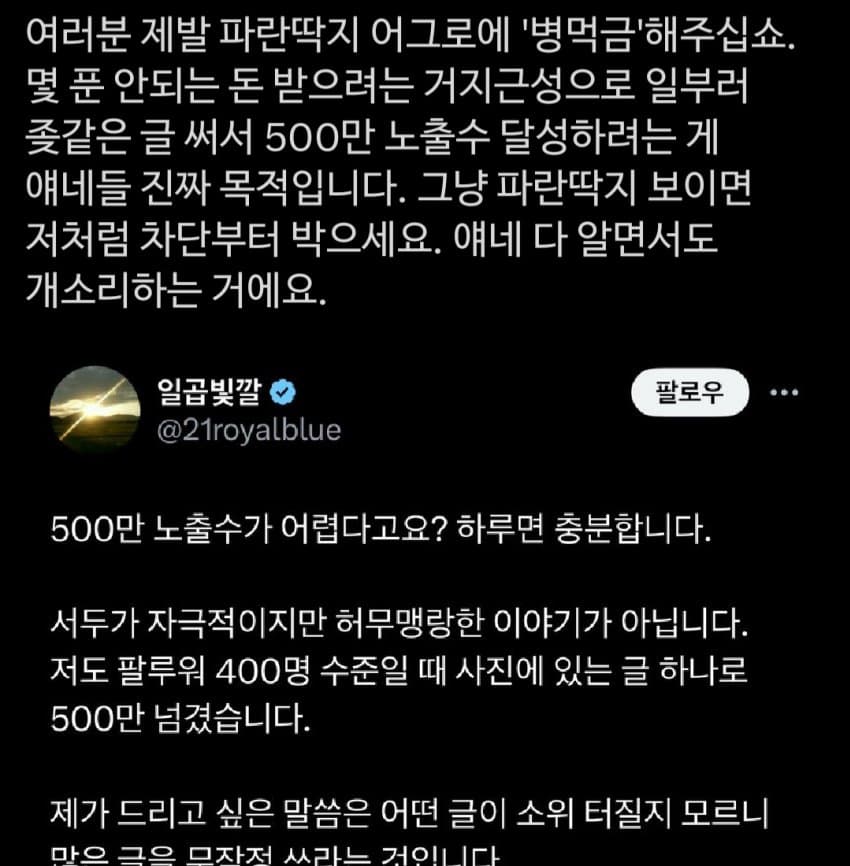 저 파란딱지 붙인 상태에서 조회수 500만을 달성하면 수익을 벌 수 있는 구조를 만들어버렸다.