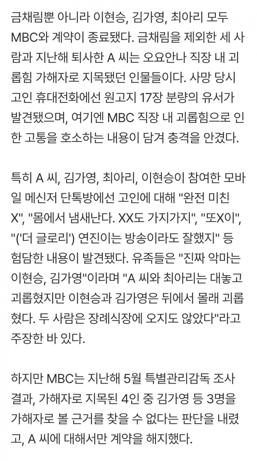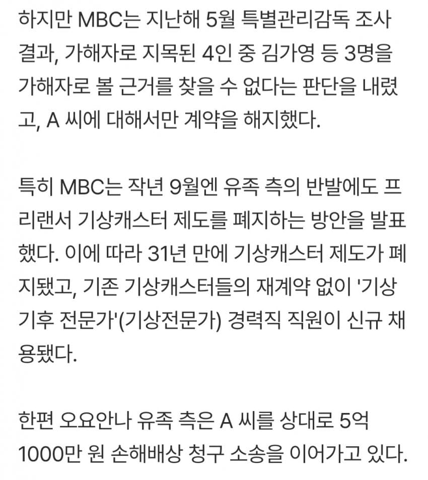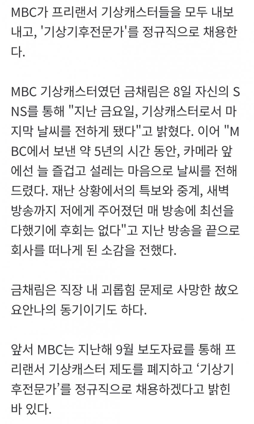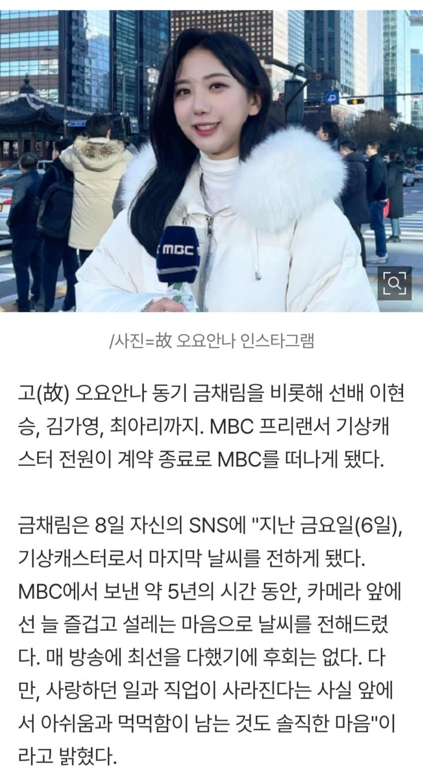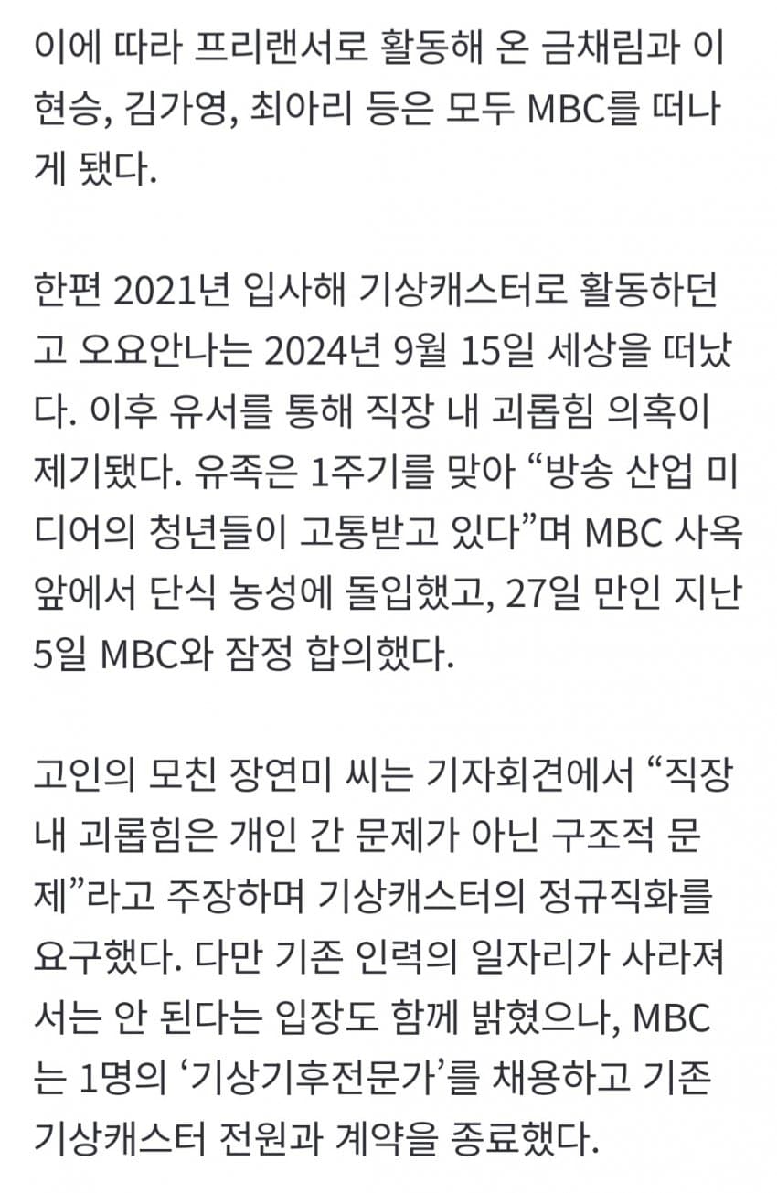 오요안나씨도 참 답답한게 부조리, 불합리를 느꼇으면 그냥 퇴사하거나 타방송사로 이직하면 되는거 아닌가? 게다가 계약직이였으면서 뭔 아쉬움이 그리 컷을까